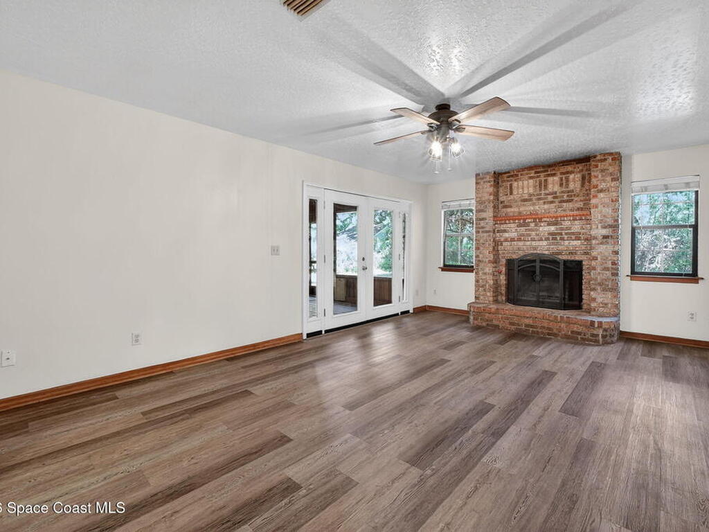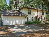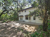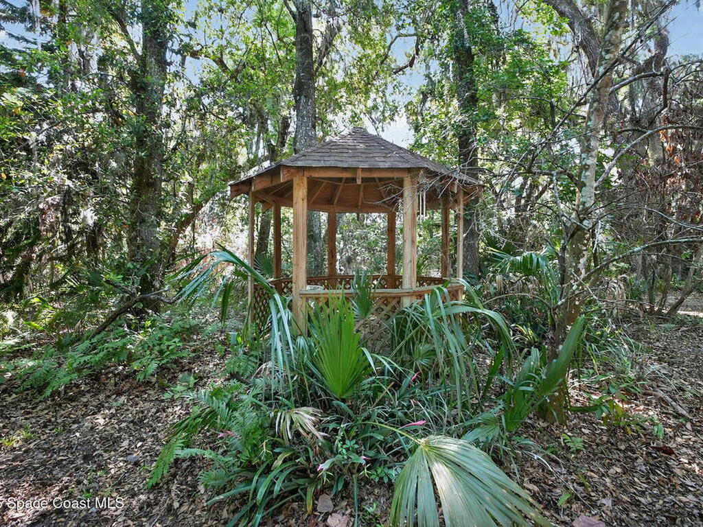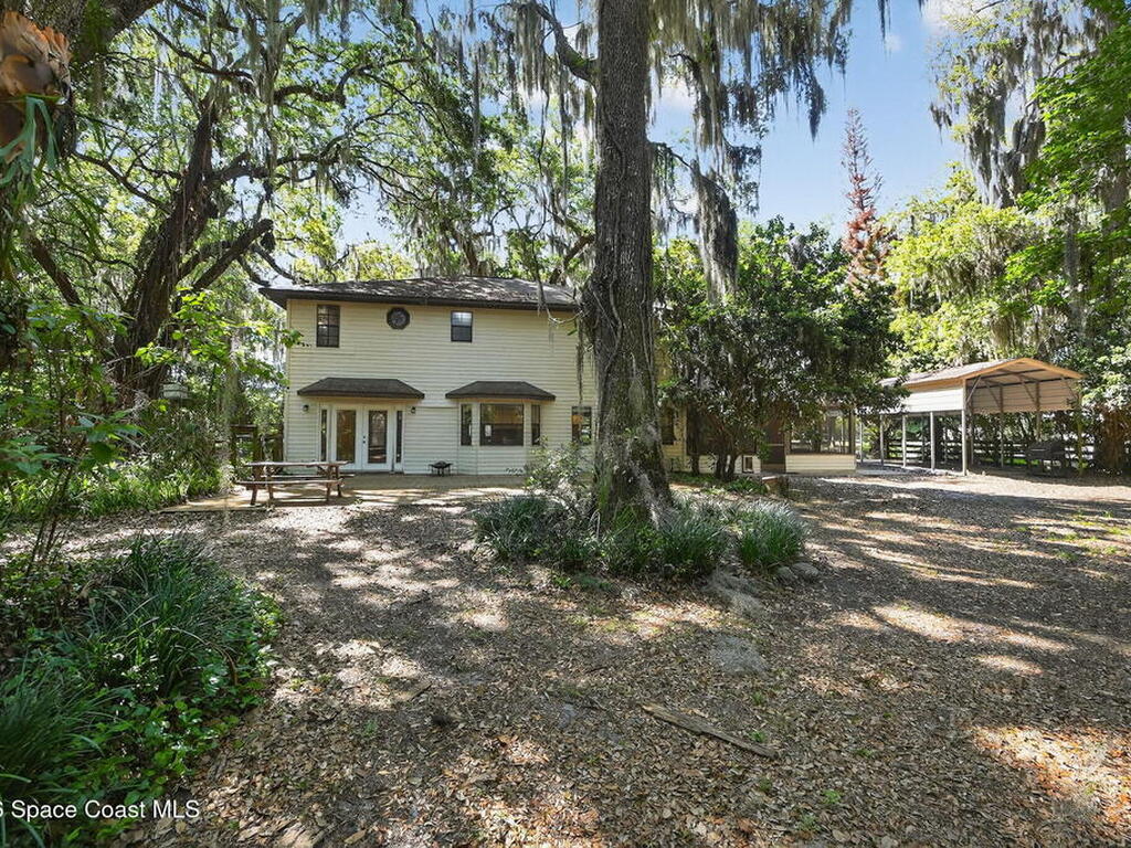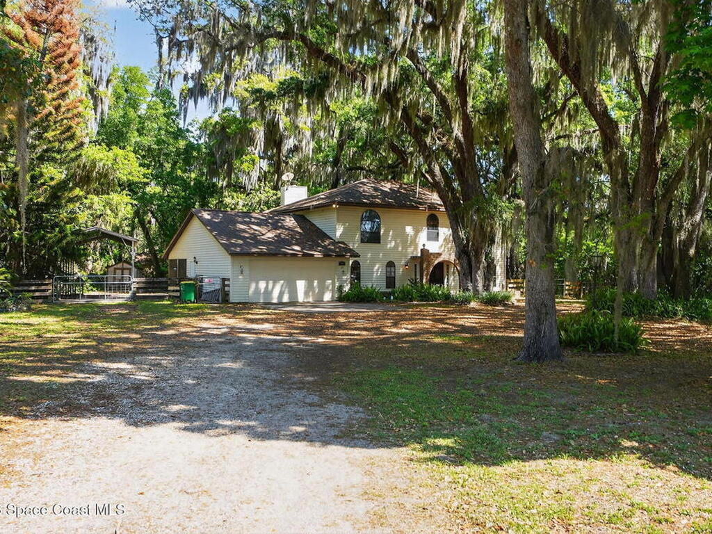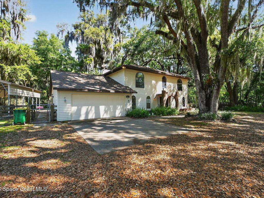 The expansive 2, 574 sq. ft. interior features a formal living and dining area highlighted by a cozy wood-burning fireplace. The updated kitchen is a culinary dream, boasting solid wood cabinetry, high-end stainless steel appliances, a large pantry, and a convenient breakfast nook that overlooks the lush backyard. Retreat upstairs to find a generous master suite featuring a massive bathroom with a separate tub and shower. Step out onto the covered patio or host guests on the massive rear deck overlooking a serene landscape of oaks and exotic foliage. Enjoy peaceful afternoons by the pond or relax in the private gazebo. The property also includes a 2-car attached garage and plenty of space for your boat or RV. Located just east of US-1, you are only 10 minutes from Downtown Titusville and close to local boat ramps for premier fishing.