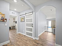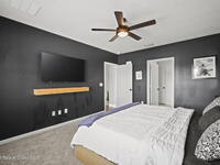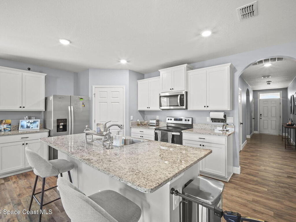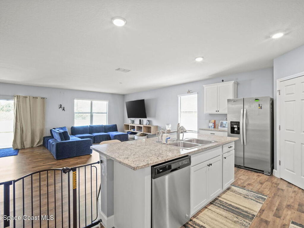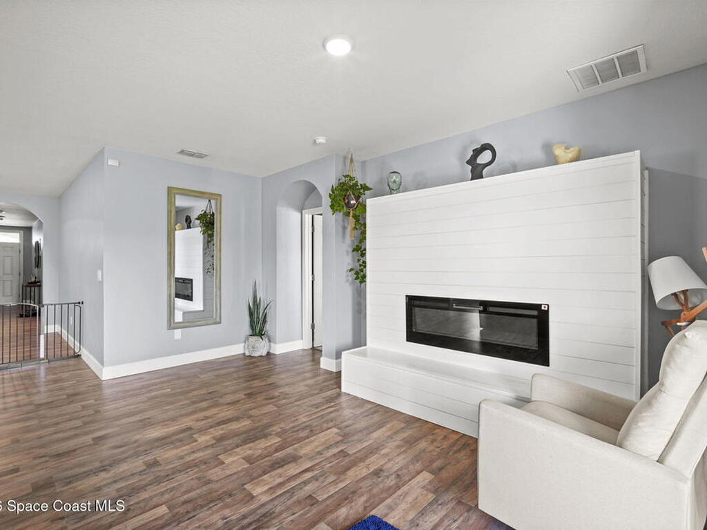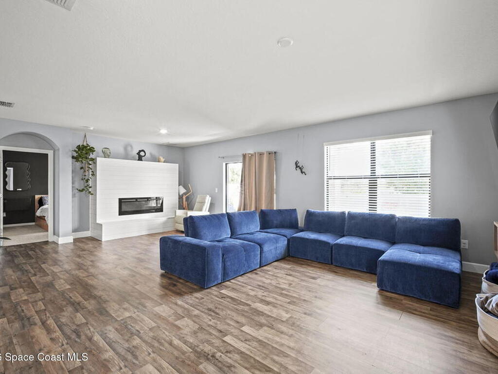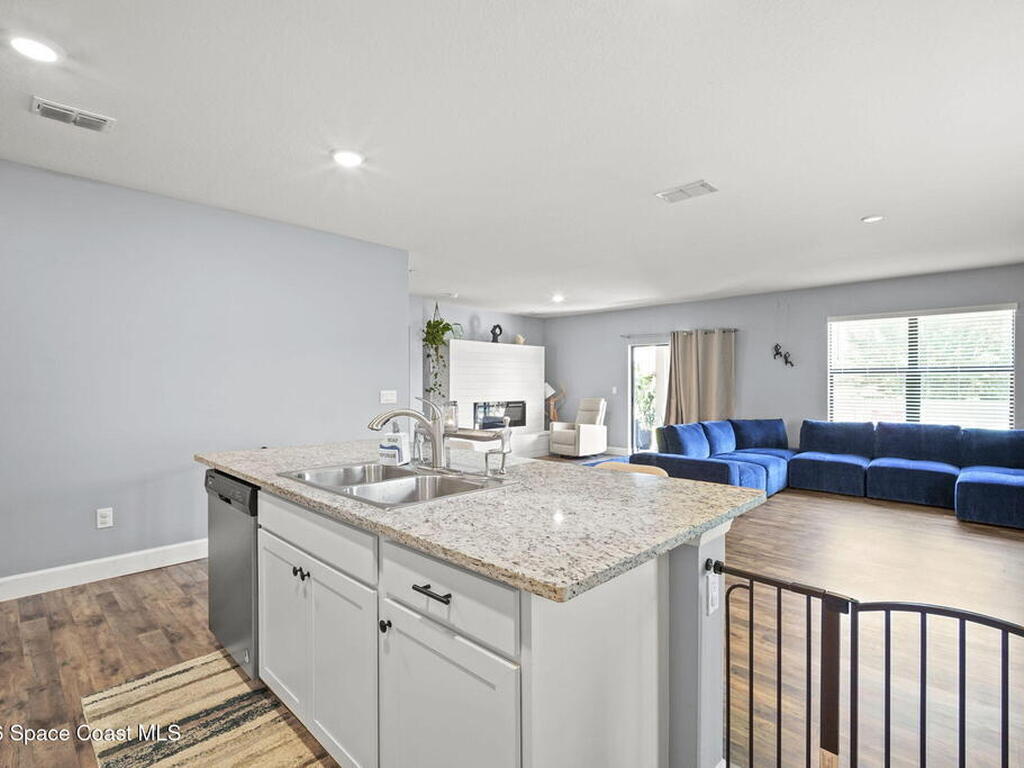 Welcome to this beautifully maintained, move in-ready residence offering the perfect blend of modern design, functionality, and everyday comfort. From the moment you arrive, the paved driveway and clean, well kept exterior set the tone for what awaits inside.Step through the front entry into a thoughtfully designed open concept layout featuring durable vinyl flooring, neutral tones, and an abundance of natural light throughout. The expansive living area is anchored by a stunning custom fireplace feature wall, creating a true focal point and an ideal space for both relaxing and entertaining.The kitchen seamlessly connects to the main living space and is equipped with granite countertops, white cabinetry, stainless steel appliances, and a large center island with bar seating, perfect for hosting or casual dining. The open flow allows for effortless interaction between the kitchen, dining, and living areas.The primary suite offers a private retreat with ample space,