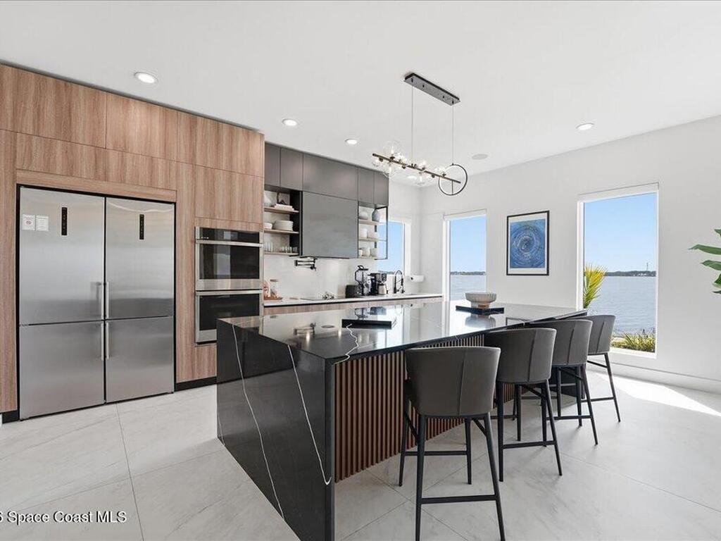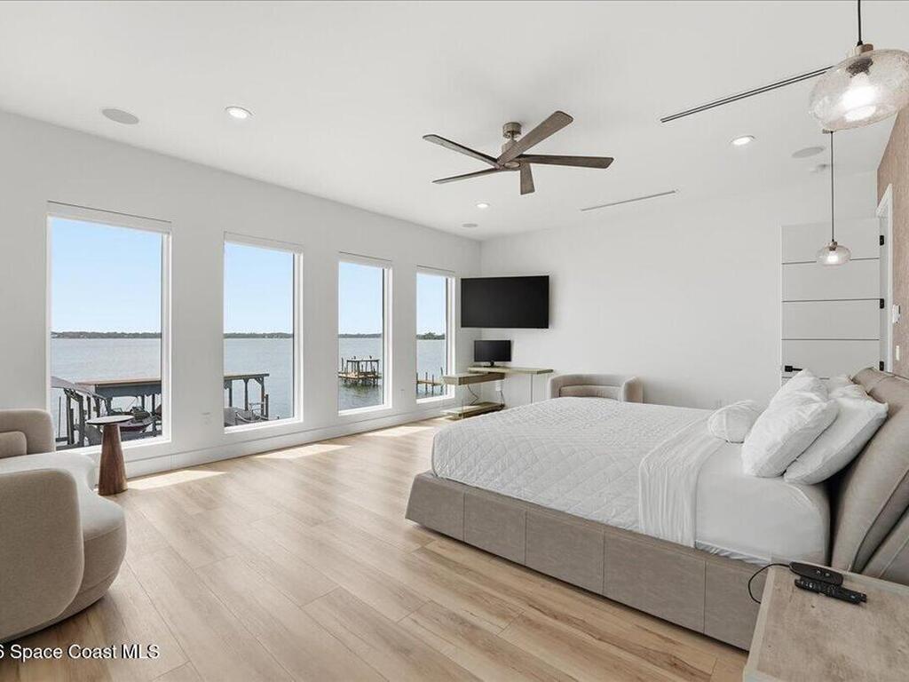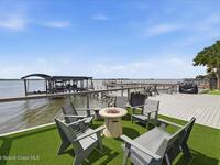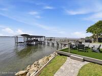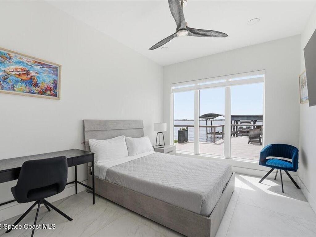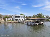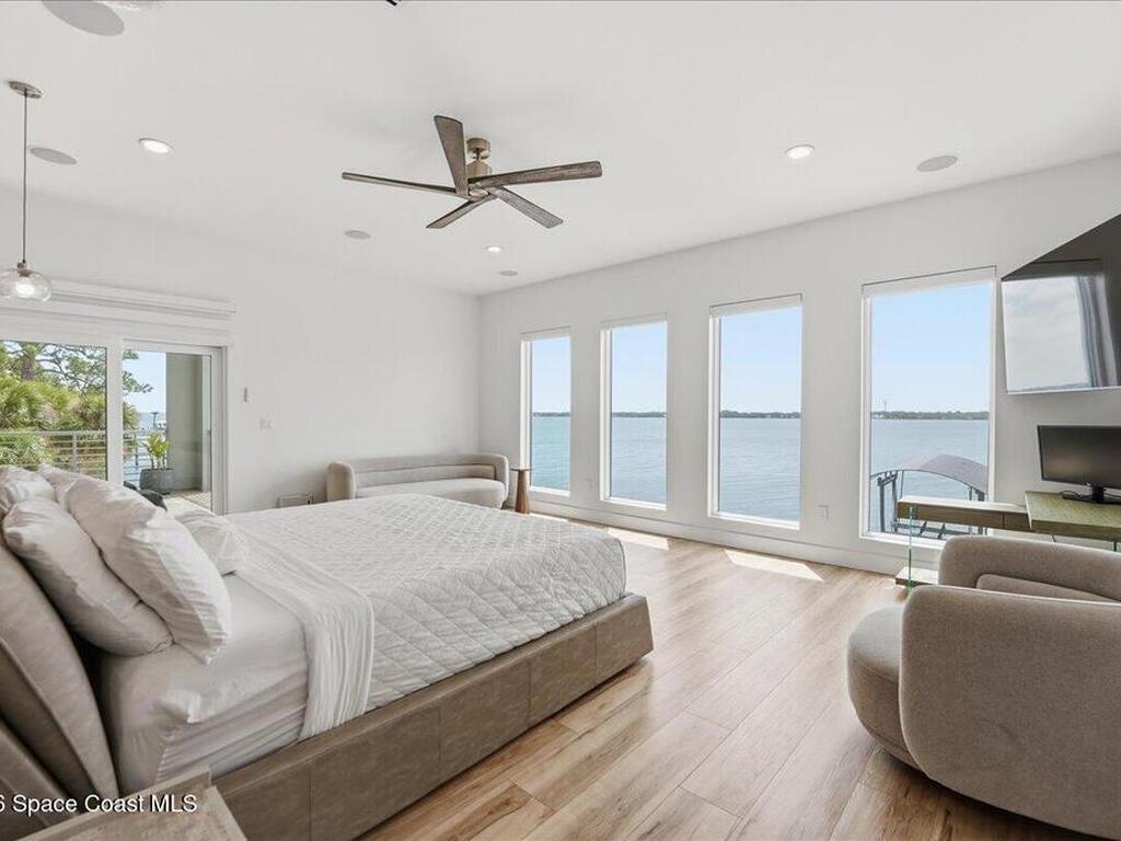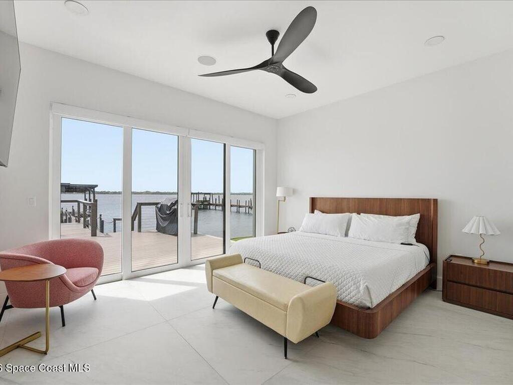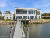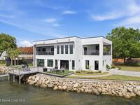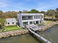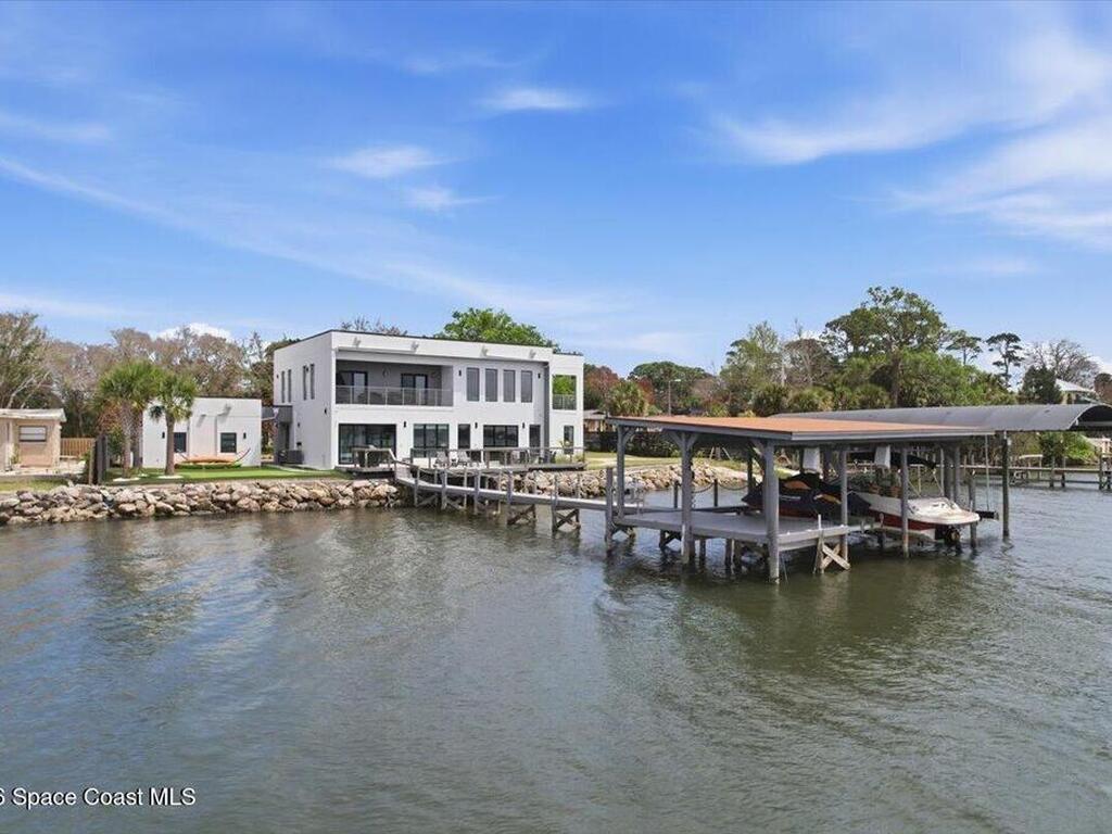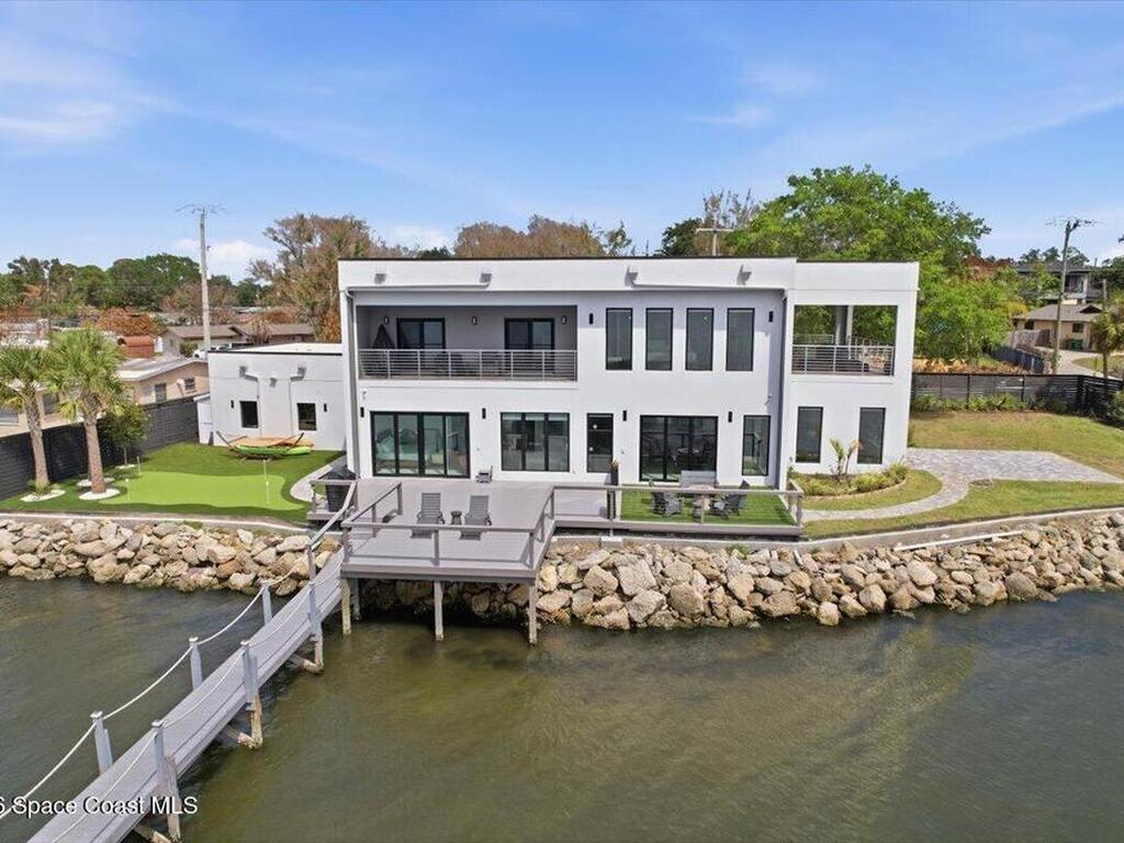 Modern Waterfront Masterpiece on Merritt Island with 151 feet of direct Indian River frontage. This 2024-built two-story home features full concrete block construction, a commercial-grade roof, and high-end modern finishes throughout. Offering 5 bedrooms, 4 full baths, and a 2-car garage, this fully furnished residence is truly turnkey. The designer kitchen, custom built-in closets, smart home features, motorized shades, and smart toilets elevate the living experience. The expansive upstairs primary suite includes a private covered terrace, wraparound closet, and a stunning spa bath with designer tile and luxury shower. Enjoy a covered boat dock with lift, jet ski dock, putting green, and side yard. West-facing balconies capture breathtaking sunsets with views of dolphins and manatees. Located near Cocoa Village with quick access to the Atlantic Ocean, 45 minutes to Orlando International Airport and 1 hour to Disney. Truly one of a kind.