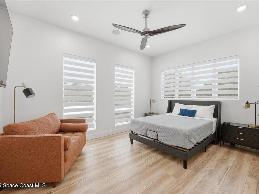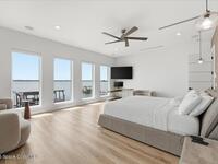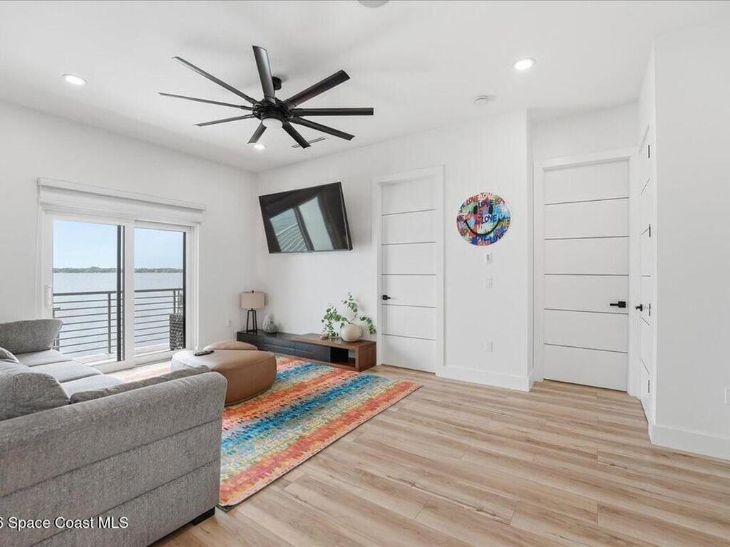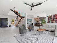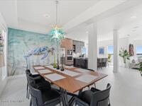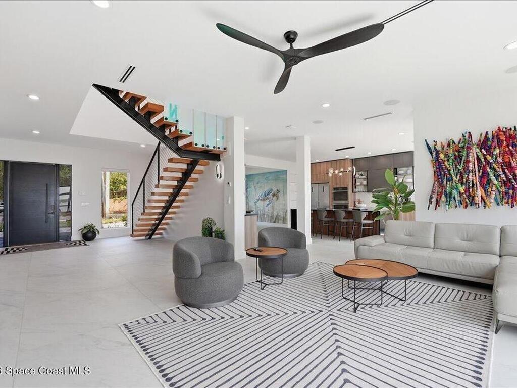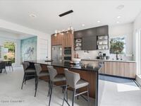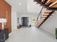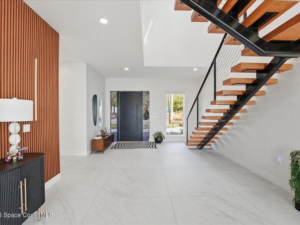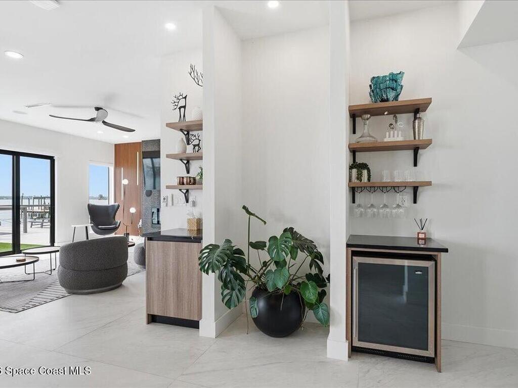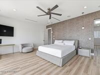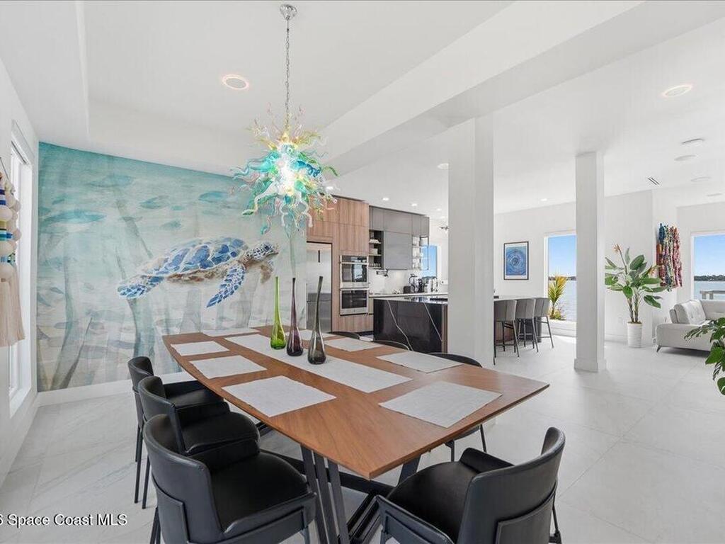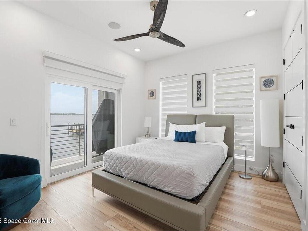 Modern Waterfront Masterpiece on Merritt Island with 151 feet of direct Indian River frontage. This 2024-built two-story home features full concrete block construction, a commercial-grade roof, and high-end modern finishes throughout. Offering 5 bedrooms, 4 full baths, and a 2-car garage, this fully furnished residence is truly turnkey. The designer kitchen, custom built-in closets, smart home features, motorized shades, and smart toilets elevate the living experience. The expansive upstairs primary suite includes a private covered terrace, wraparound closet, and a stunning spa bath with designer tile and luxury shower. Enjoy a covered boat dock with lift, jet ski dock, putting green, and side yard. West-facing balconies capture breathtaking sunsets with views of dolphins and manatees. Located near Cocoa Village with quick access to the Atlantic Ocean, 45 minutes to Orlando International Airport and 1 hour to Disney. Truly one of a kind.