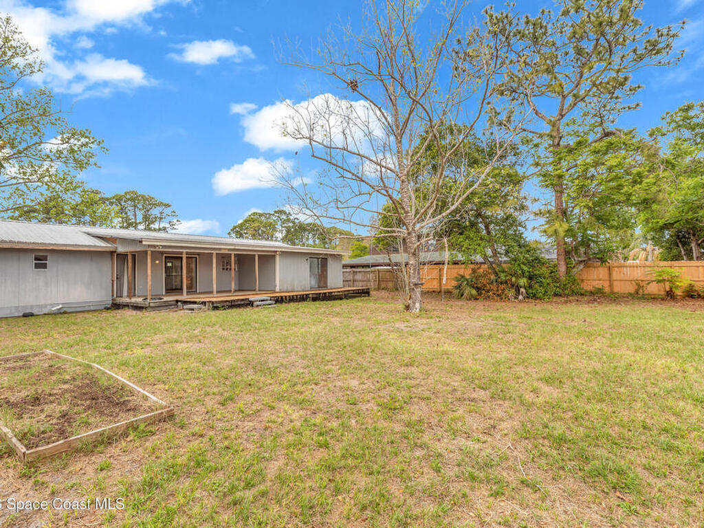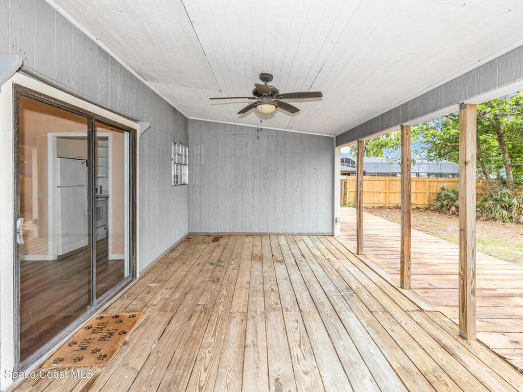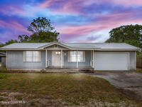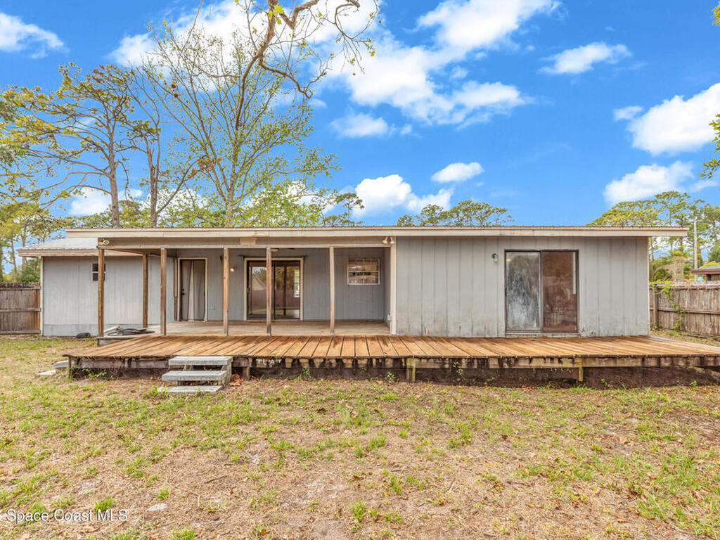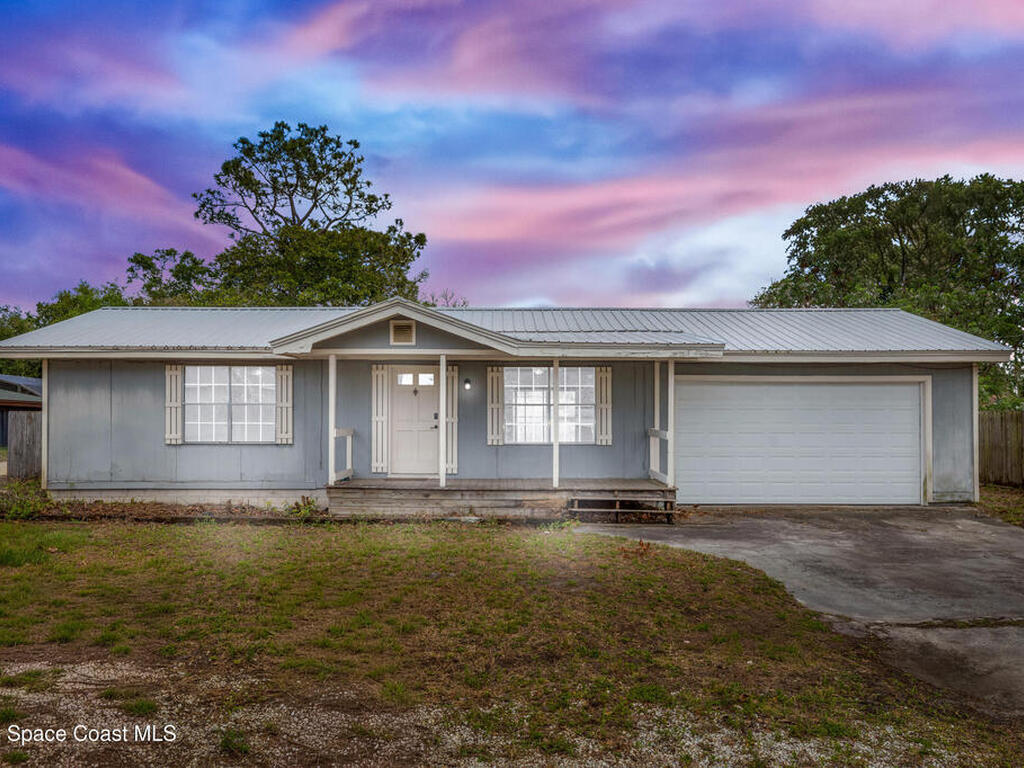 Two bedroom, two bathroom, two-car garage home located in the desirable Port St. John community. Nestled in a quiet neighborhood, this property offers a wonderful opportunity for a FIRST-TIME HOMEBUYER, INVESTOR, or anyone looking to personalize while building equity. The home features a durable METAL ROOF and a NEWER AC SYSTEM, providing peace of mind on major components. A charming FRONT ROCKING CHAIR PORCH WITH DECORATIVE PILLARS welcomes you in. The layout offers a functional GALLEY-STYLE KITCHEN WITH ADJACENT DINING AREA, flowing into a spacious GREAT ROOM with UPDATED LAMINATE FLOORING. The PRIMARY BEDROOM FEATURES LAMINATE FLOORING. Out back, enjoy a LARGE ENCLOSED UNDER-TRUSS PATIO WITH DECK, perfect for relaxing or entertaining. Located near NASA, Kennedy Space Center, SpaceX, and Blue Origin, with easy access to the coast and local amenities.