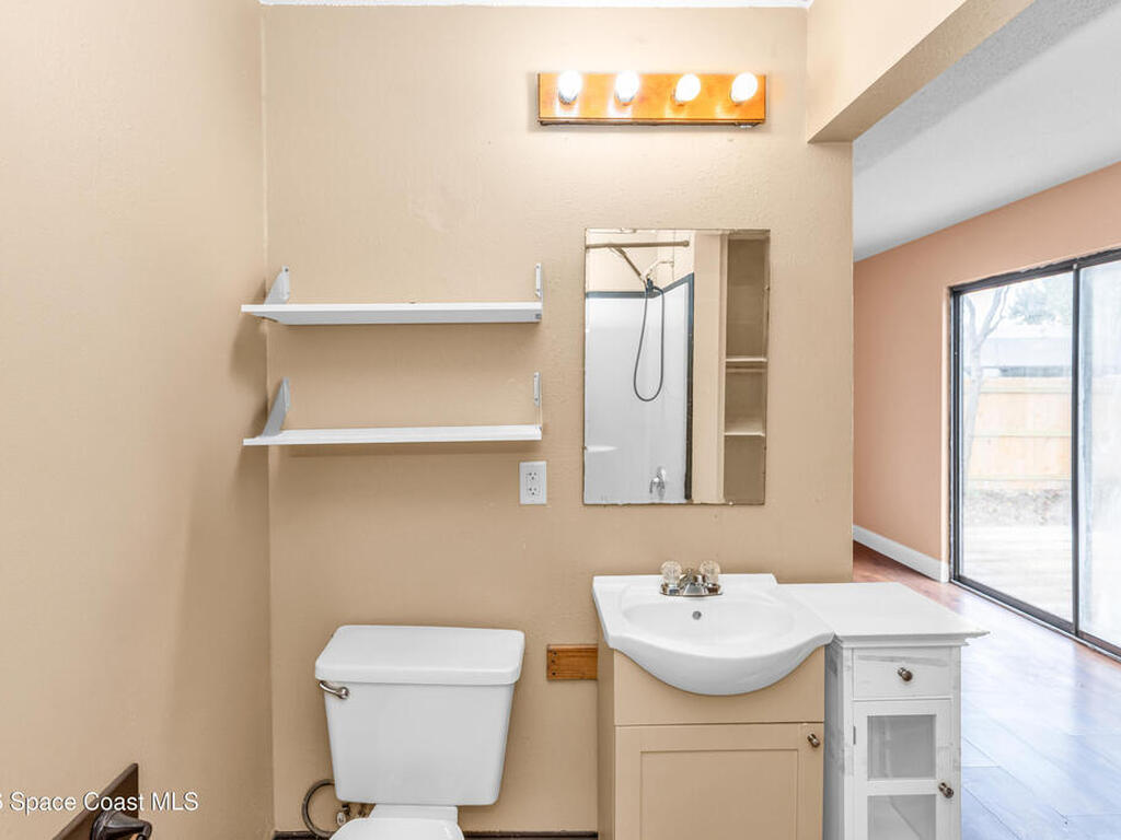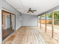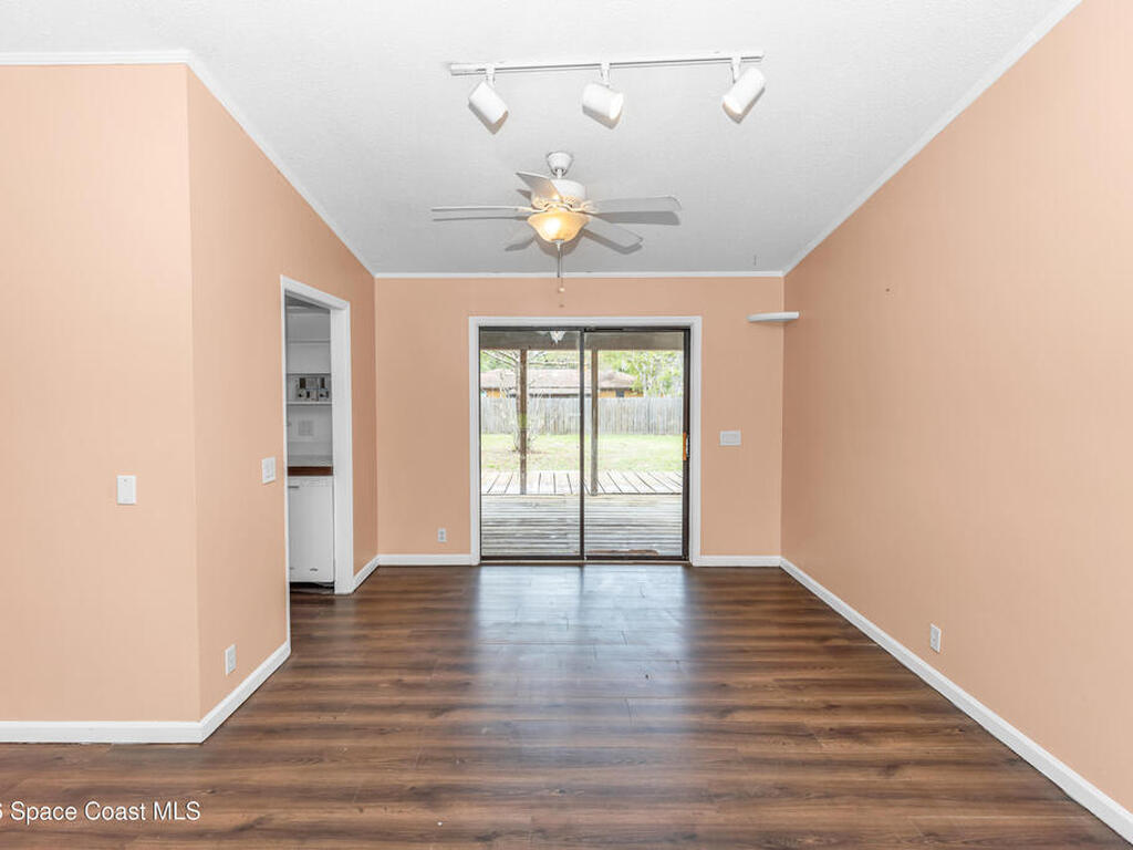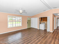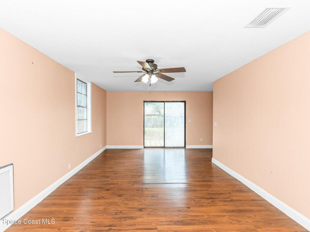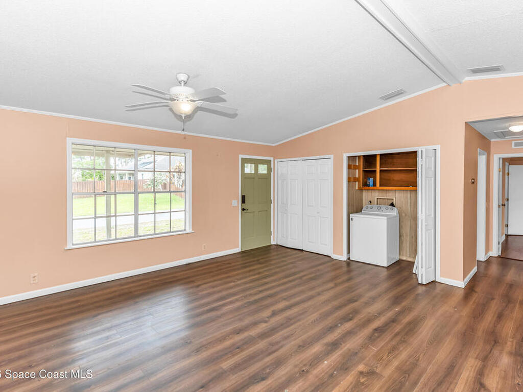 Two bedroom, two bathroom, two-car garage home located in the desirable Port St. John community. Nestled in a quiet neighborhood, this property offers a wonderful opportunity for a FIRST-TIME HOMEBUYER, INVESTOR, or anyone looking to personalize while building equity. The home features a durable METAL ROOF and a NEWER AC SYSTEM, providing peace of mind on major components. A charming FRONT ROCKING CHAIR PORCH WITH DECORATIVE PILLARS welcomes you in. The layout offers a functional GALLEY-STYLE KITCHEN WITH ADJACENT DINING AREA, flowing into a spacious GREAT ROOM with UPDATED LAMINATE FLOORING. The PRIMARY BEDROOM FEATURES LAMINATE FLOORING. Out back, enjoy a LARGE ENCLOSED UNDER-TRUSS PATIO WITH DECK, perfect for relaxing or entertaining. Located near NASA, Kennedy Space Center, SpaceX, and Blue Origin, with easy access to the coast and local amenities.