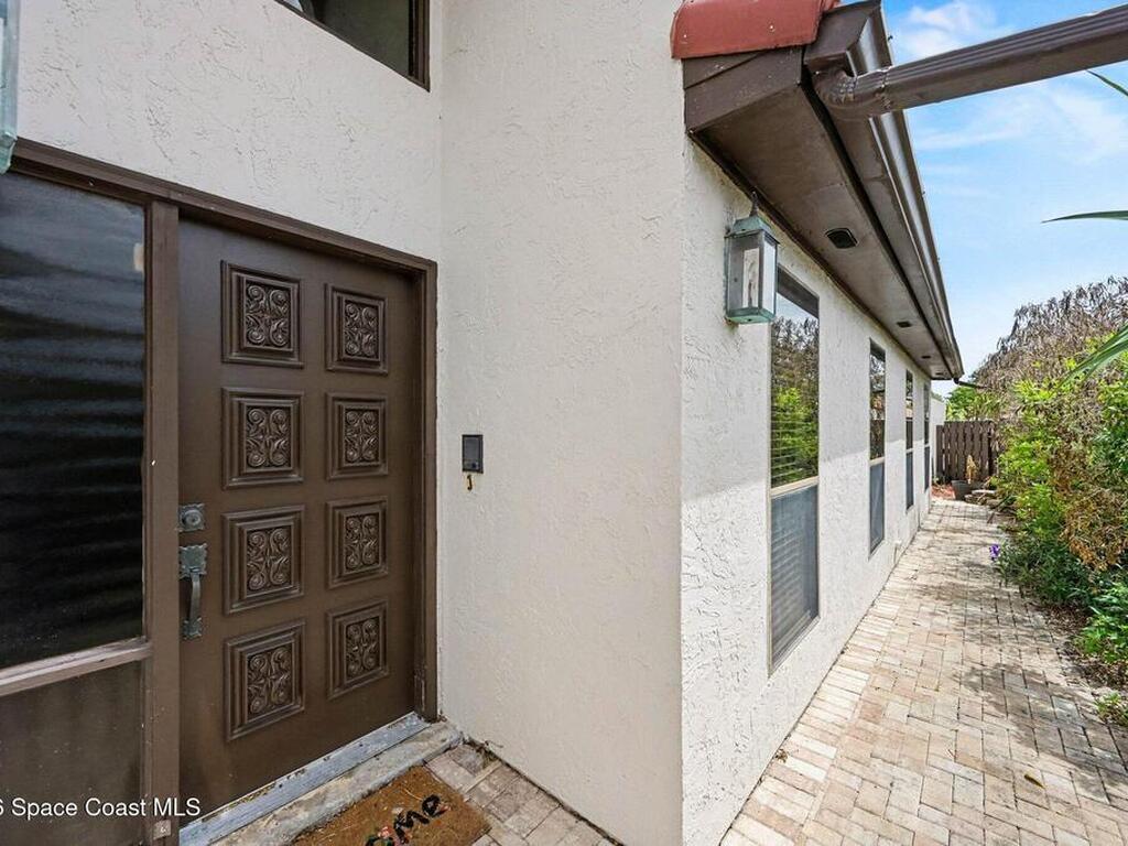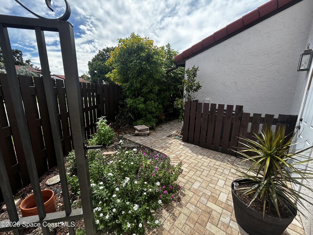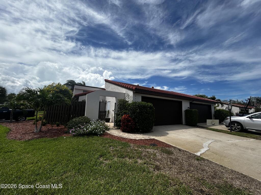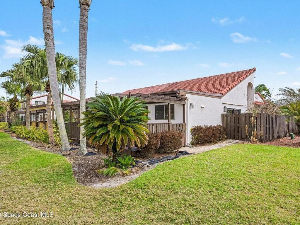 You will love this wide open end unit townhome in Suntree! This home offers 2 full bathrooms and 2 bedrooms, with an office. Just under 2000 square feet. The ceilings are vaulted and give such a wide open feel! Located in a popular golf course neighborhood with a pool only a few doors away. Roof is 5 years old, stainless steel appliances in the kitchen. Close to shops, restaurants, and easy highway access. Spacious outdoor space expansive side courtyard and rear patio area with pergola. The HOA will be replacing the back fence.