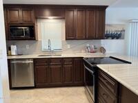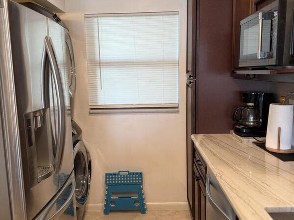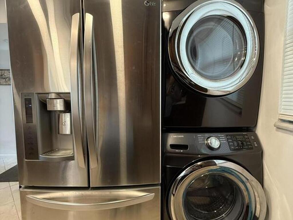 Dishwasher, Electric Range, Microwave, Refrigerator, Washer/Dryer Stacked