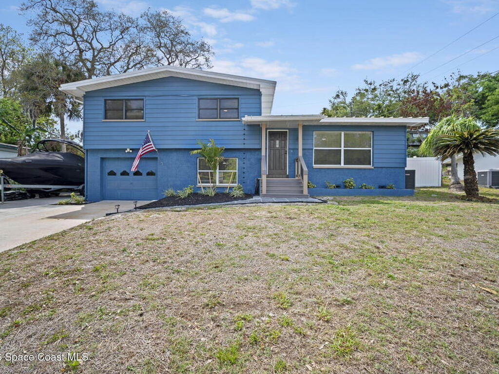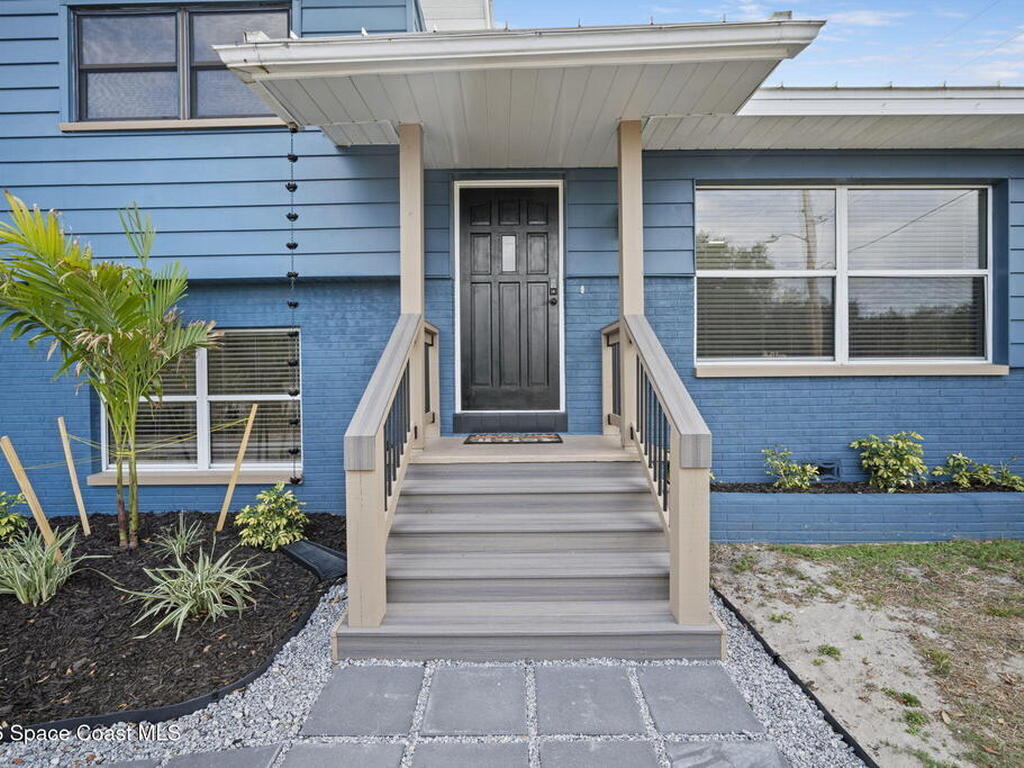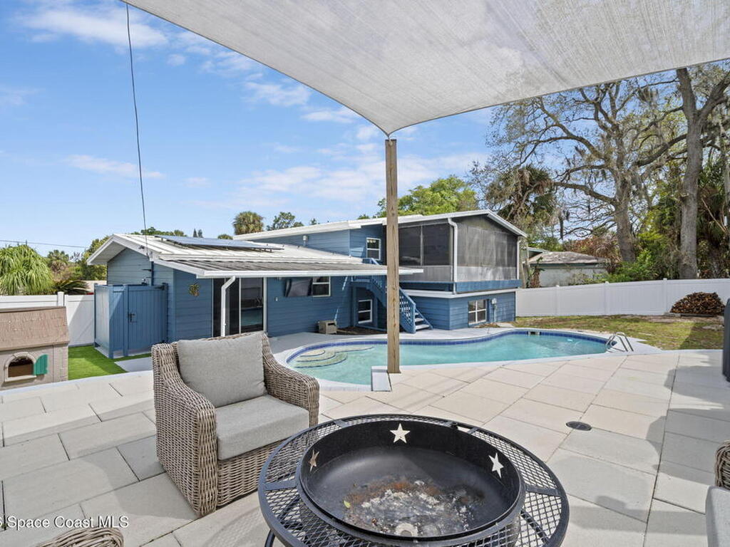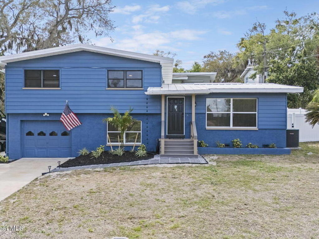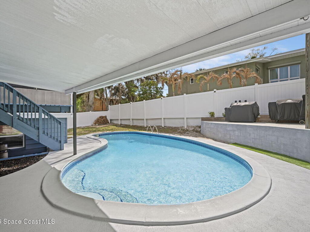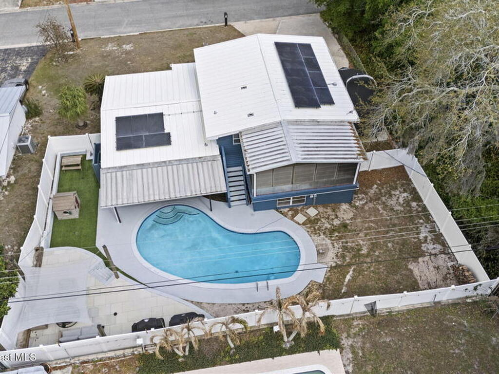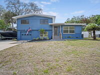 Beautifully updated and move in ready in the highly desired neighborhood of River Heights, with close access to US1 and 528. The feeling of ''Home'' springs to life the minute you walk in the front door with a bright and open floor plan leading to the kitchen with grey shaker cabinetry, butcher block counters, center island, and newer stainless steel appliances. Upstairs you will find 3 generous bedrooms, 2 recently updated bathrooms, with the primary en suite offering a walk in closet, balcony/Florida room and the bathroom boasting luxury finishes. Downstairs you will find a separate office/den space, 4th bedroom, and laundry room, all lined with vinyl plank flooring. Outside the fun never ends with custom raised entertaining deck that is perfect for a fire pit, spacious pool, outdoor shower, and vinyl fenced in yard. 2011 Metal Roof, 2025 AC and duct work, New Insulation, 2018 Paid Off Solar, 2020 Water Heater, Updated Elec Panel, Copper Wiring, No Popcorn Ceilings, and More