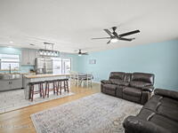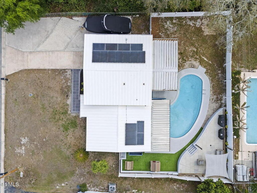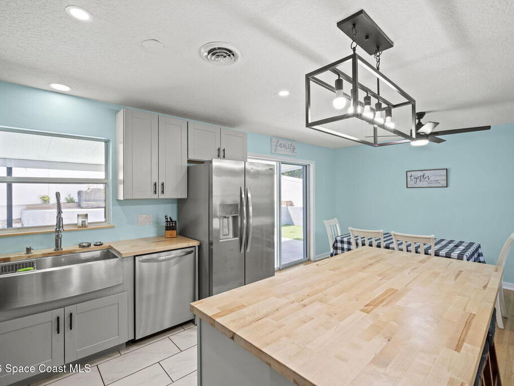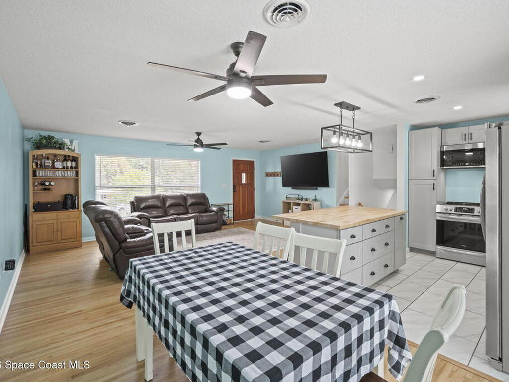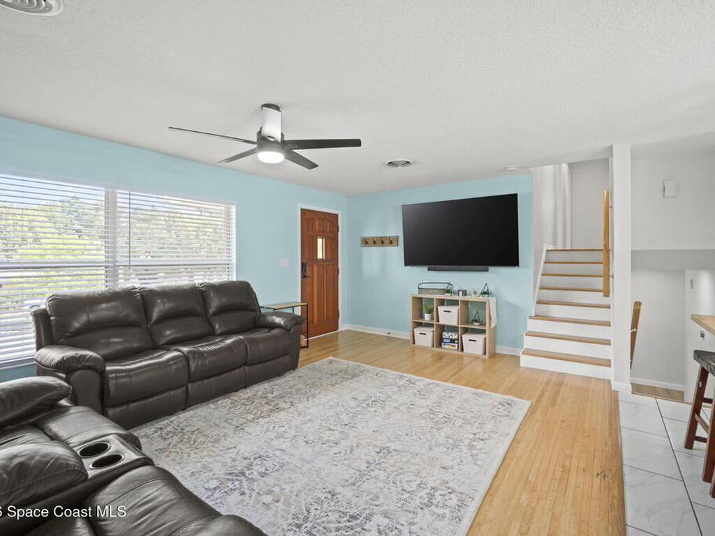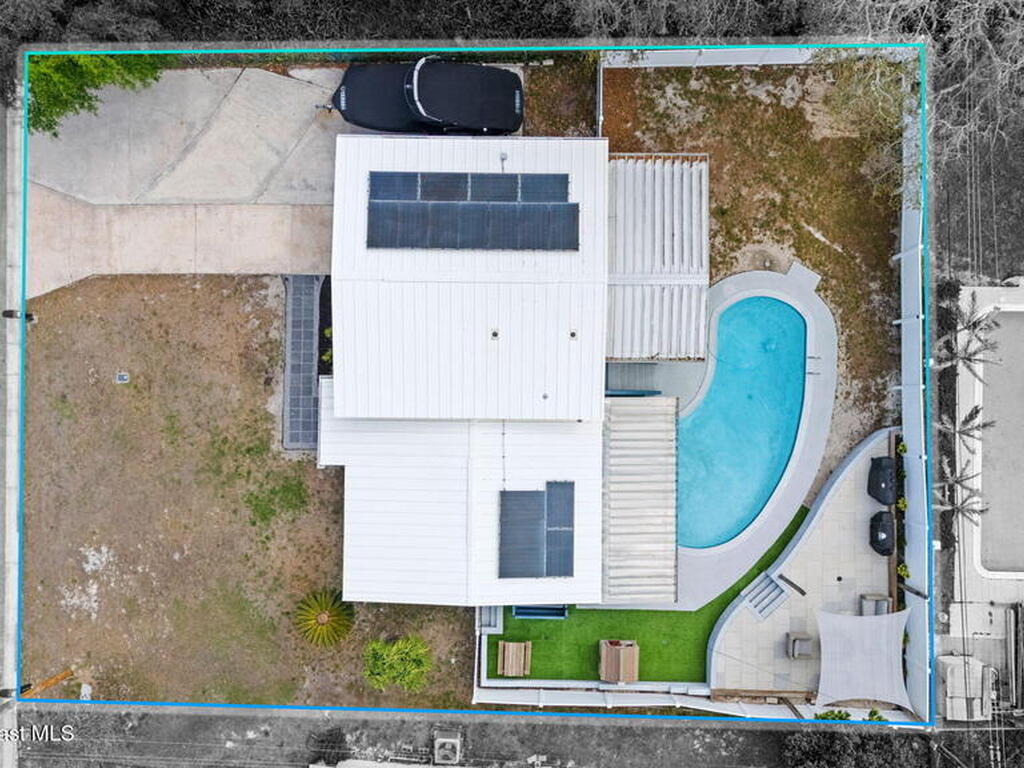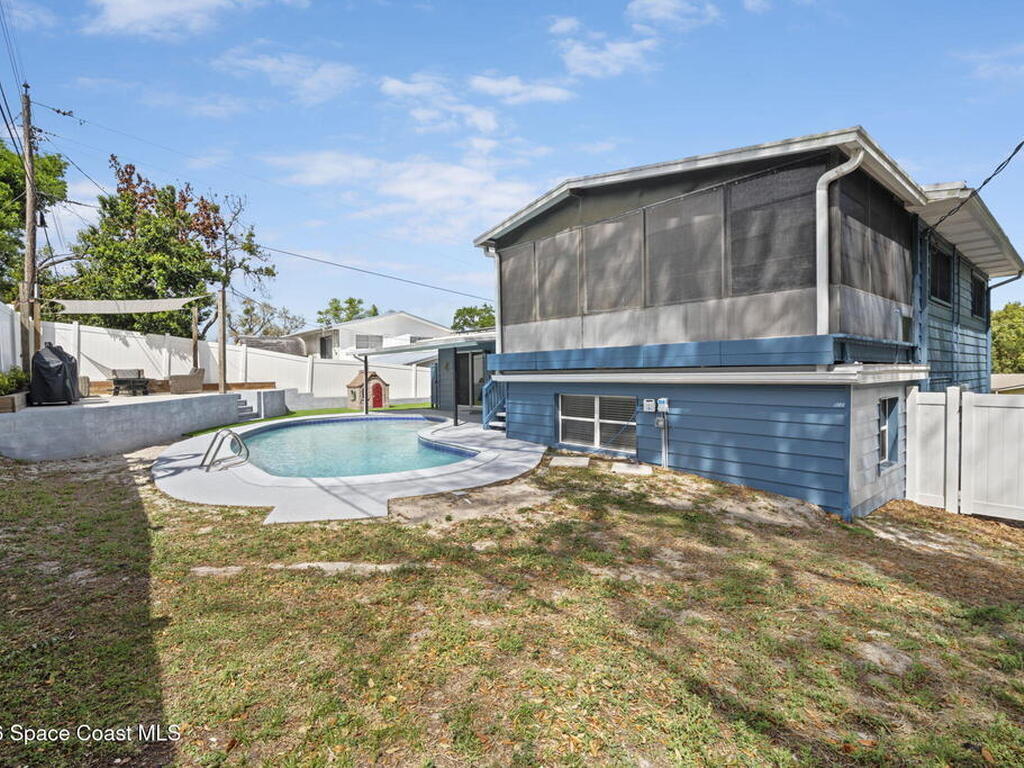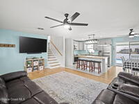 Beautifully updated and move in ready in the highly desired neighborhood of River Heights, with close access to US1 and 528. The feeling of ''Home'' springs to life the minute you walk in the front door with a bright and open floor plan leading to the kitchen with grey shaker cabinetry, butcher block counters, center island, and newer stainless steel appliances. Upstairs you will find 3 generous bedrooms, 2 recently updated bathrooms, with the primary en suite offering a walk in closet, balcony/Florida room and the bathroom boasting luxury finishes. Downstairs you will find a separate office/den space, 4th bedroom, and laundry room, all lined with vinyl plank flooring. Outside the fun never ends with custom raised entertaining deck that is perfect for a fire pit, spacious pool, outdoor shower, and vinyl fenced in yard. 2011 Metal Roof, 2025 AC and duct work, New Insulation, 2018 Paid Off Solar, 2020 Water Heater, Updated Elec Panel, Copper Wiring, No Popcorn Ceilings, and More