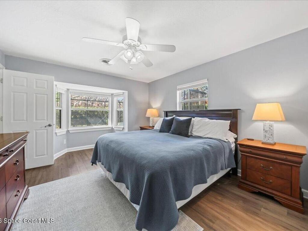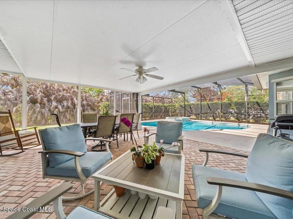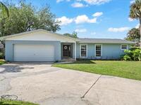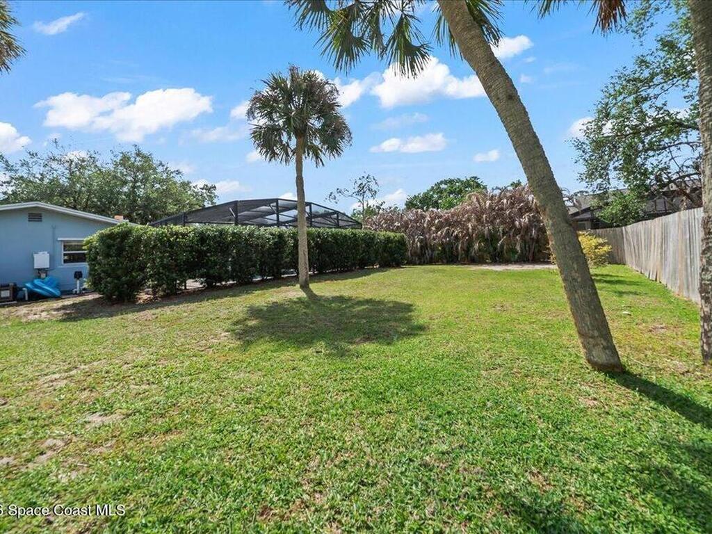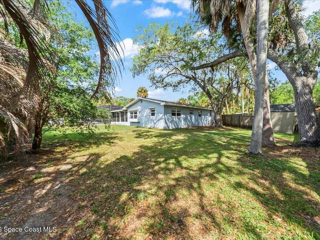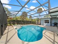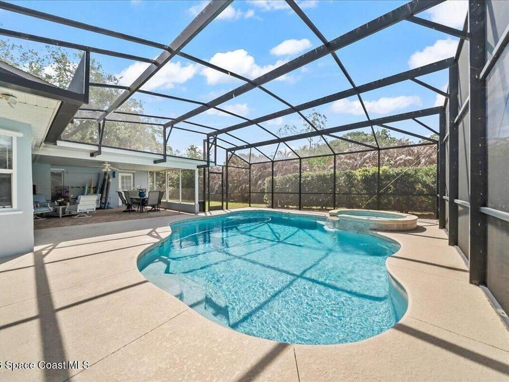 Welcome to your private oasis in South Merritt Estates! This beautifully maintained 3 bedroom, 2 bath home sits on a spacious half-acre lot with a fully-fenced backyard. The interior features both a formal living room and a family room, providing plenty of space for entertaining or relaxing. Step outside to your own backyard paradise, featuring a heated screened-in pool and hot tub, the ideal spot for year-round outdoor living. As part of this great community, you'll also enjoy access to a dock and boat ramp on the Indian River, the perfect spot to enjoy the beautiful sunsets. Major upgrades including a new roof (2021) and a new AC with all-new air ducts (2022).