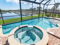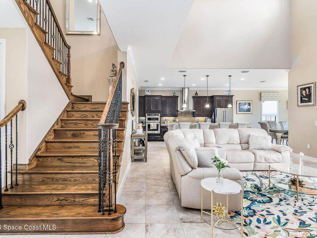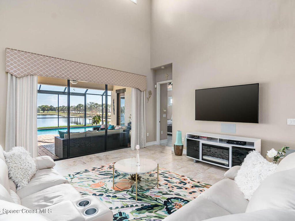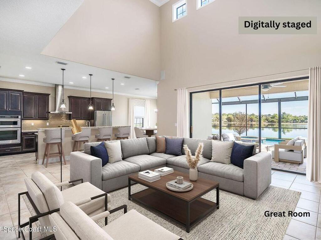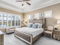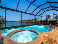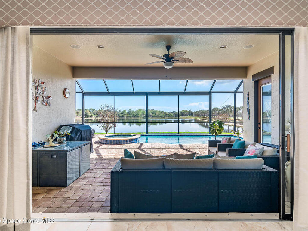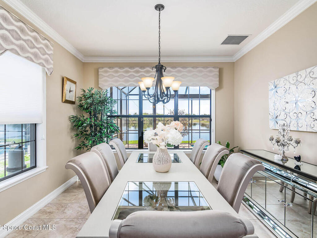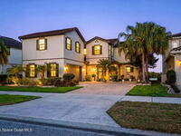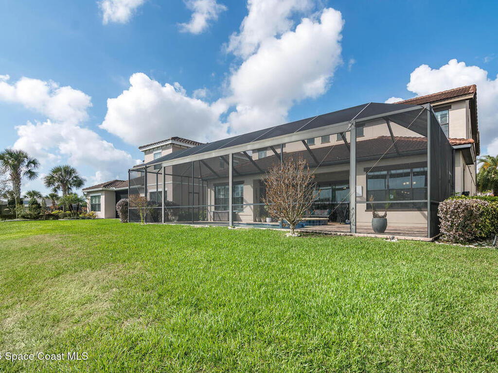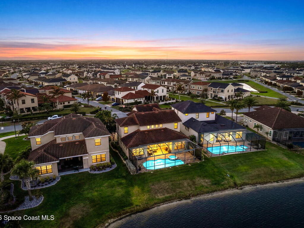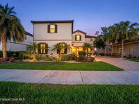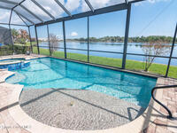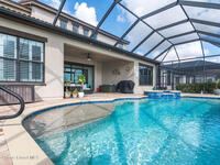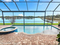 Former model home in Viera West with sweeping lake and preserve views! No rear neighbors. Outdoor oasis features a heated saltwater pool, spa, and paver deck. Inside: soaring ceilings and plantation shutters. Complete split plan with privacy for all bedrooms. 4BR/4.5BA + loft ideal for your office. Every bedroom boasts its own private bath--ideal for multi-gen living. Gourmet chef's kitchen with espresso soft-close cabinetry, granite counters, 5-burner gas range, walk-in pantry, KitchenAid SS appliances. Main-level primary suite offers panoramic water views, walk-in closet with organizers, spa bath w/ soaking tub, and ceiling-height tile shower. Upstairs: custom wrought iron railing paired with a wood handrail and stairs to loft, 2 guest BRs. 4th BR suite with separate stairs--perfect for guests, media room, or office. Main living areas feature tile flooring throughout. Oversized laundry room with cabinetry and full sink. 2-car plus golf cart garage. Near Publix, Costco, A rated school