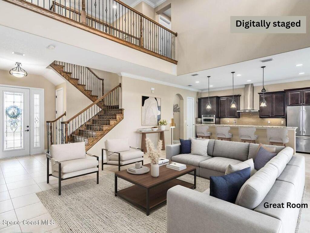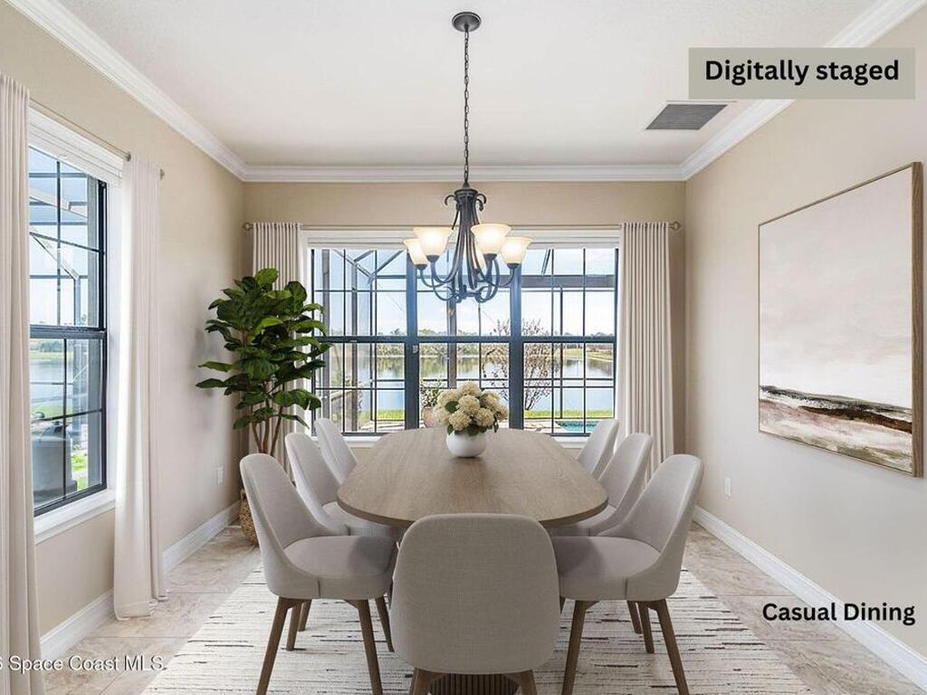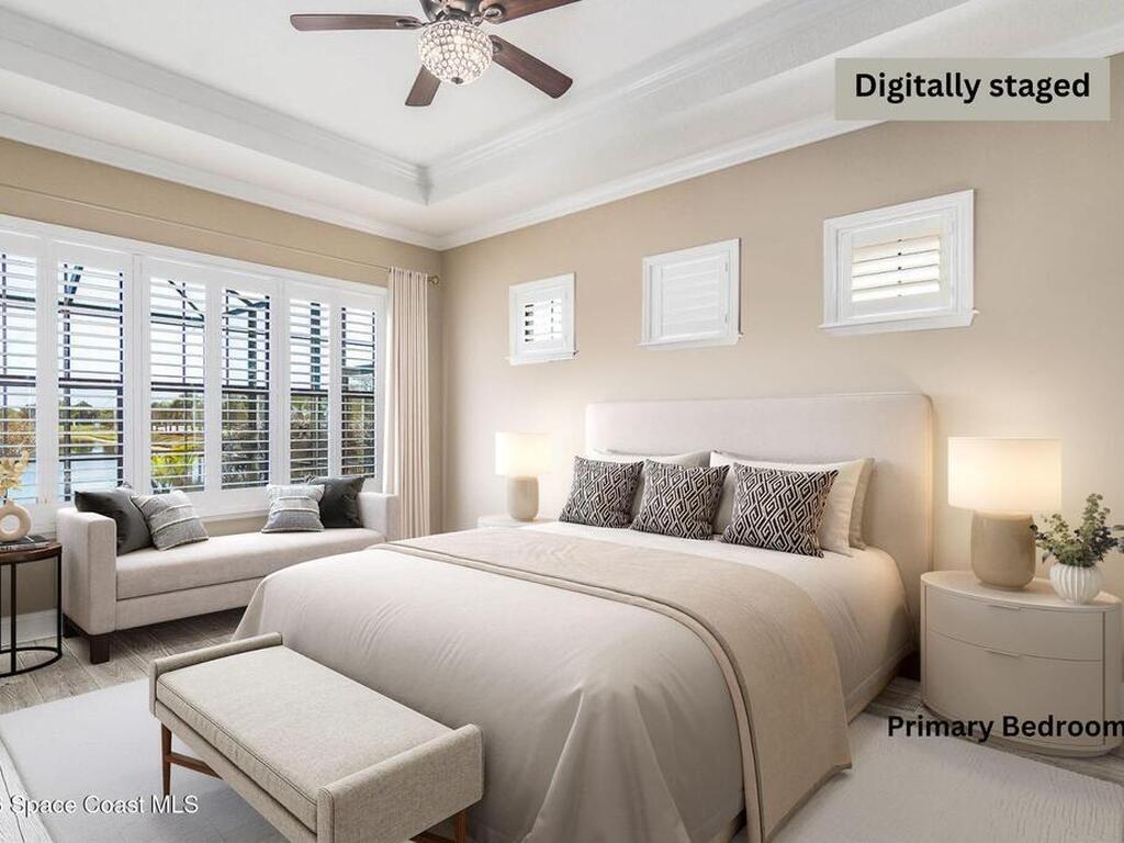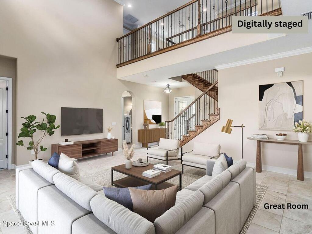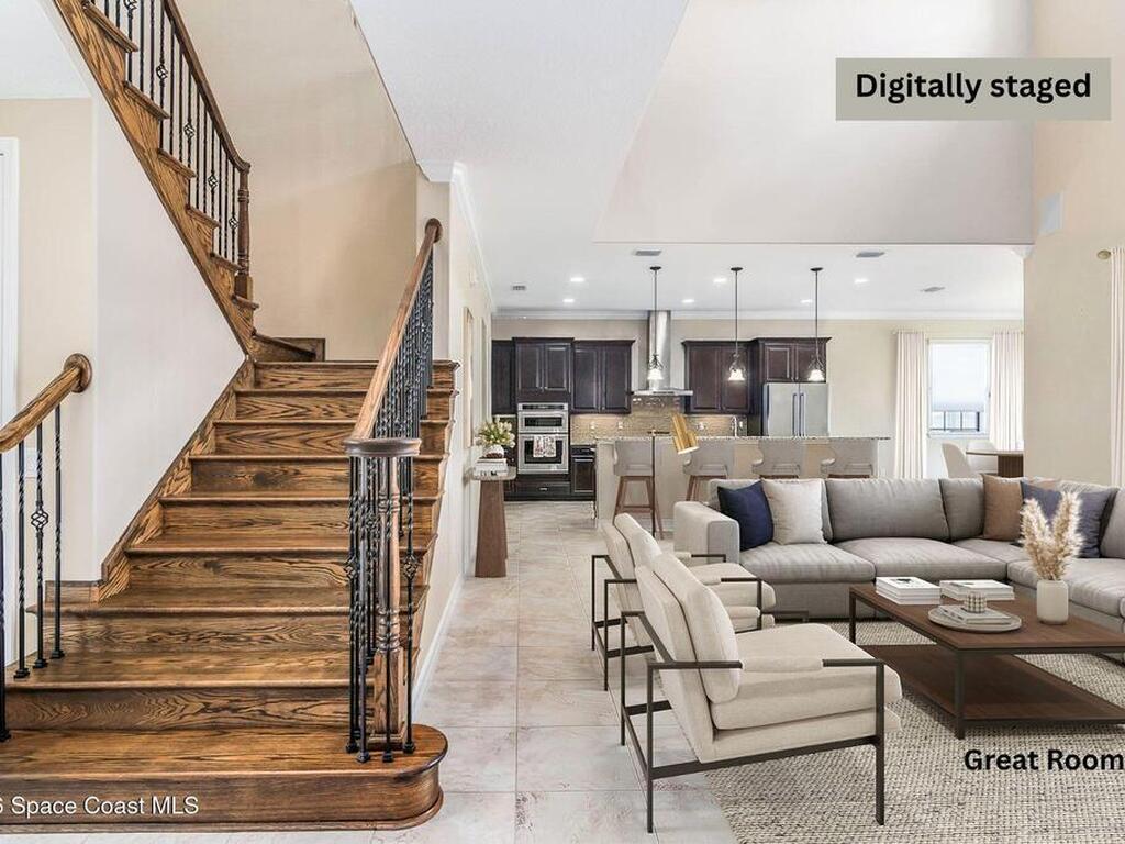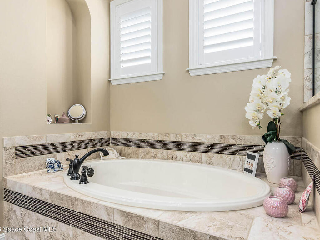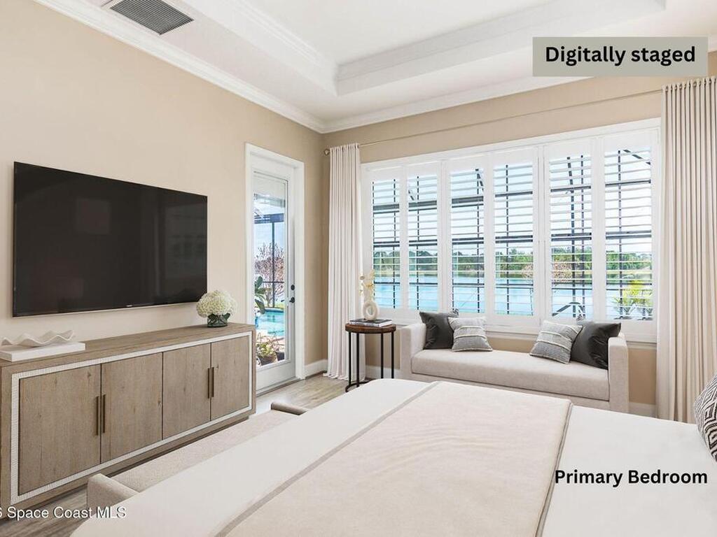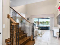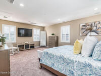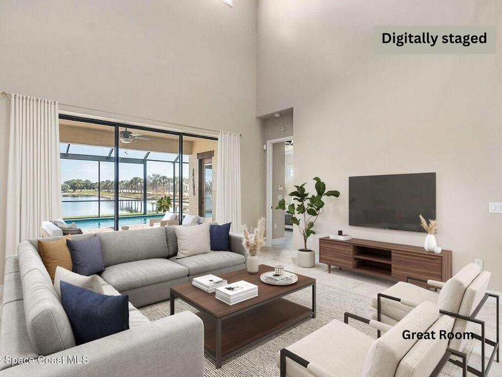 Former model home in Viera West with sweeping lake and preserve views! No rear neighbors. Outdoor oasis features a heated saltwater pool, spa, and paver deck. Inside: soaring ceilings and plantation shutters. Complete split plan with privacy for all bedrooms. 4BR/4.5BA + loft ideal for your office. Every bedroom boasts its own private bath--ideal for multi-gen living. Gourmet chef's kitchen with espresso soft-close cabinetry, granite counters, 5-burner gas range, walk-in pantry, KitchenAid SS appliances. Main-level primary suite offers panoramic water views, walk-in closet with organizers, spa bath w/ soaking tub, and ceiling-height tile shower. Upstairs: custom wrought iron railing paired with a wood handrail and stairs to loft, 2 guest BRs. 4th BR suite with separate stairs--perfect for guests, media room, or office. Main living areas feature tile flooring throughout. Oversized laundry room with cabinetry and full sink. 2-car plus golf cart garage. Near Publix, Costco, A rated school