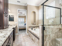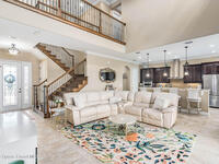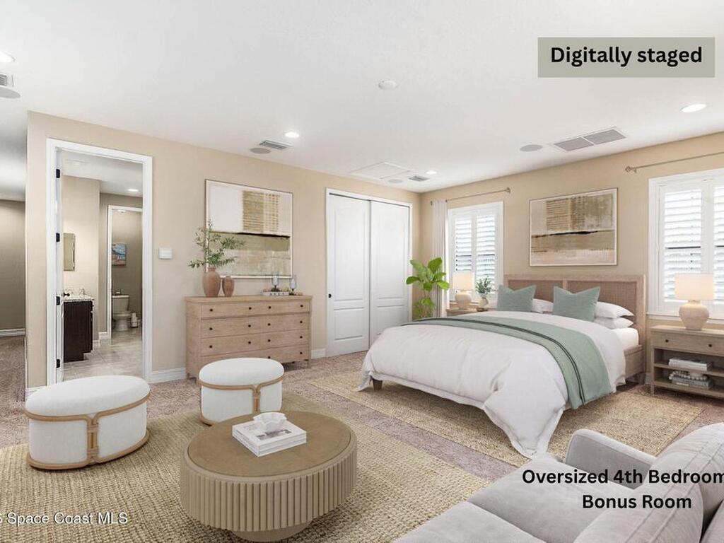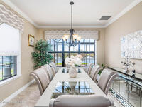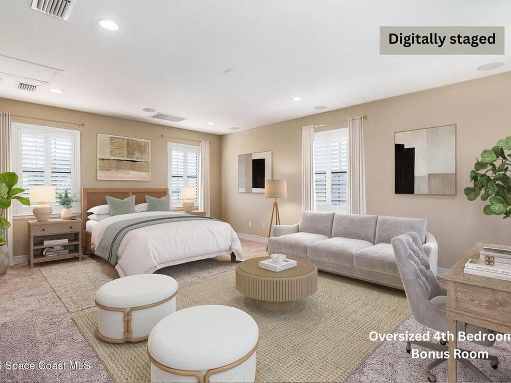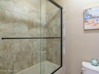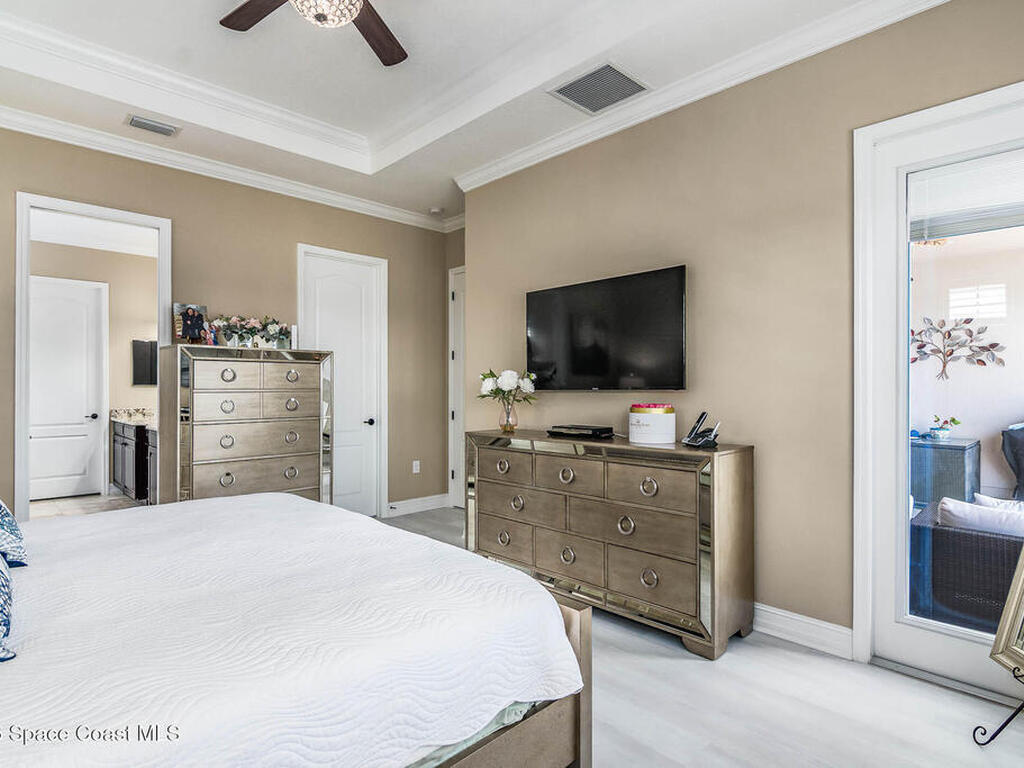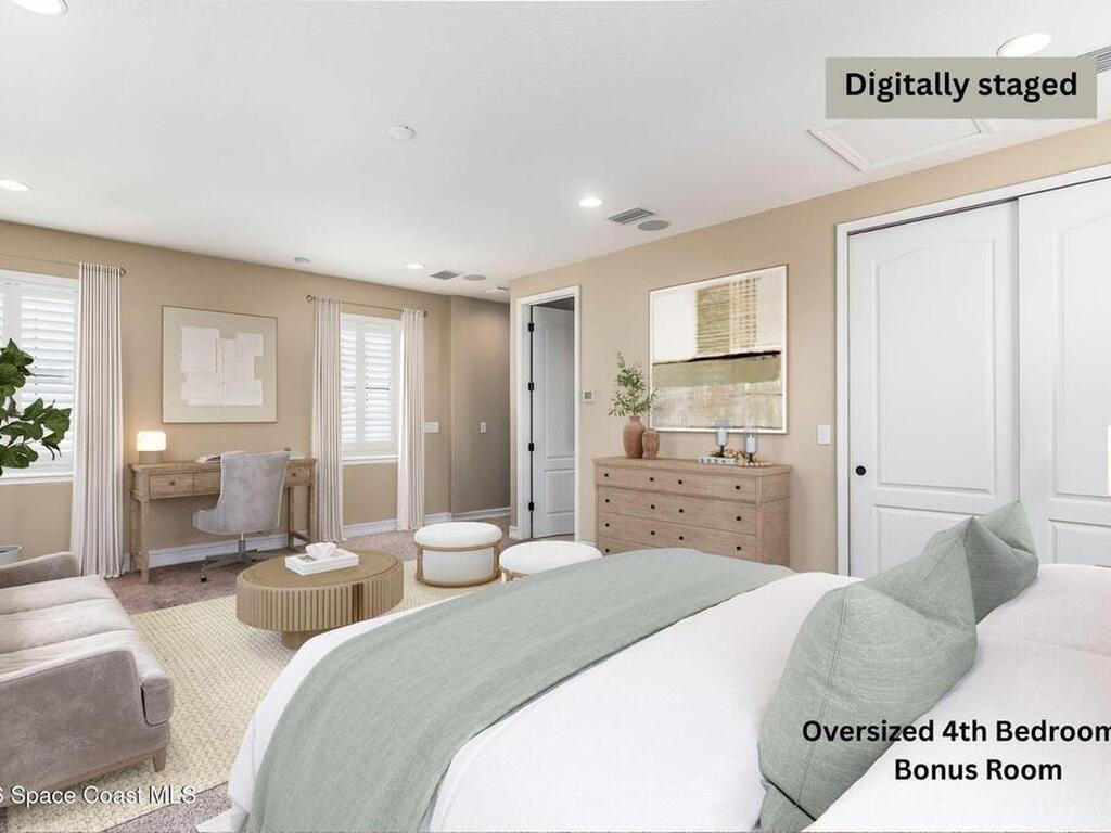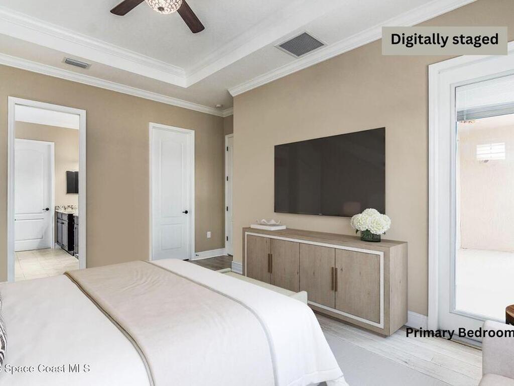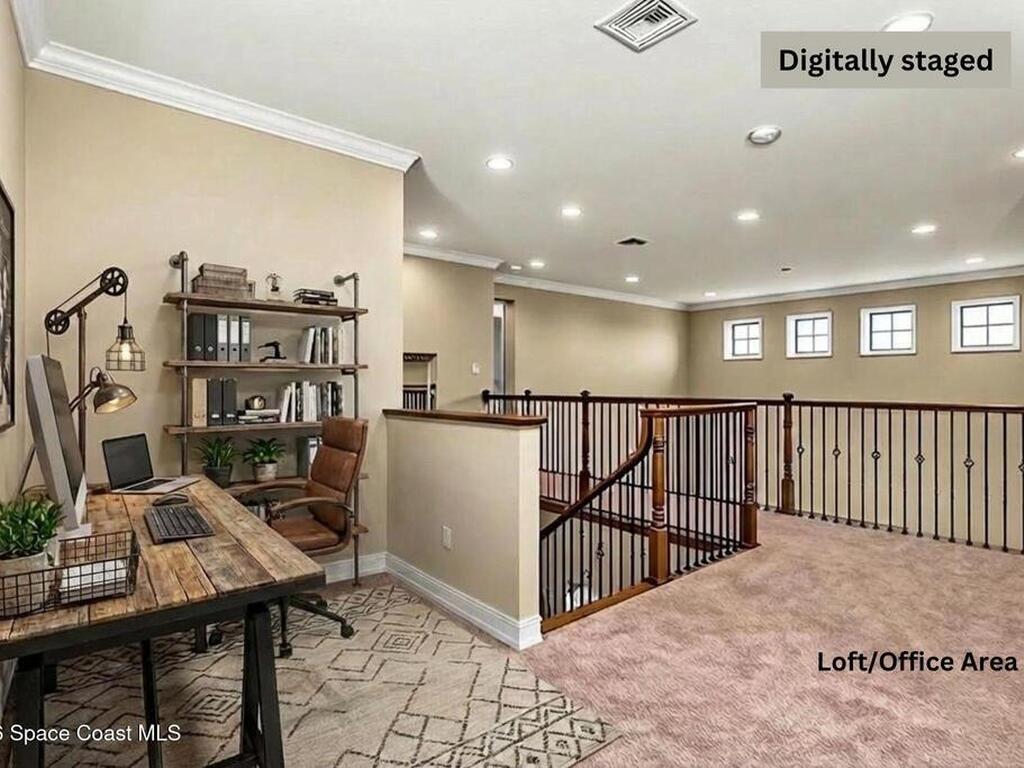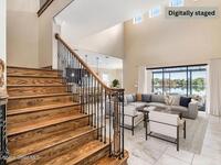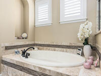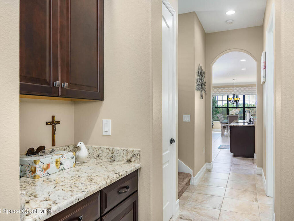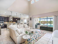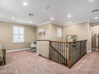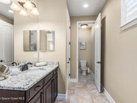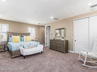 Former model home in Viera West with sweeping lake and preserve views! No rear neighbors. Outdoor oasis features a heated saltwater pool, spa, and paver deck. Inside: soaring ceilings and plantation shutters. Complete split plan with privacy for all bedrooms. 4BR/4.5BA + loft ideal for your office. Every bedroom boasts its own private bath--ideal for multi-gen living. Gourmet chef's kitchen with espresso soft-close cabinetry, granite counters, 5-burner gas range, walk-in pantry, KitchenAid SS appliances. Main-level primary suite offers panoramic water views, walk-in closet with organizers, spa bath w/ soaking tub, and ceiling-height tile shower. Upstairs: custom wrought iron railing paired with a wood handrail and stairs to loft, 2 guest BRs. 4th BR suite with separate stairs--perfect for guests, media room, or office. Main living areas feature tile flooring throughout. Oversized laundry room with cabinetry and full sink. 2-car plus golf cart garage. Near Publix, Costco, A rated school