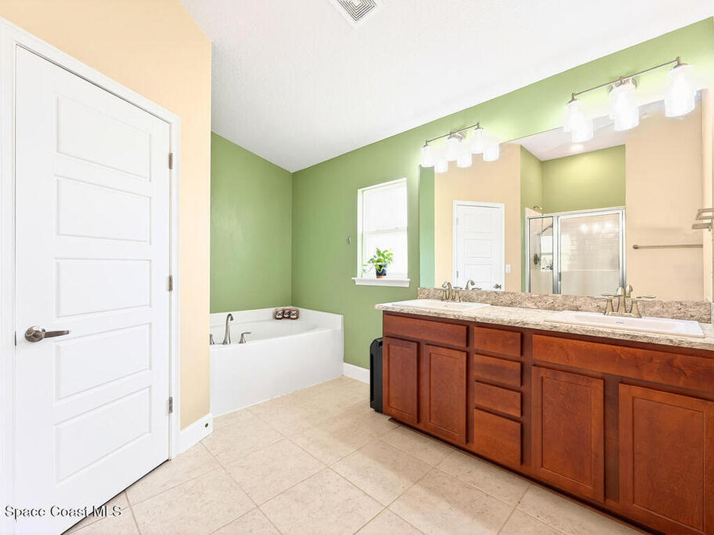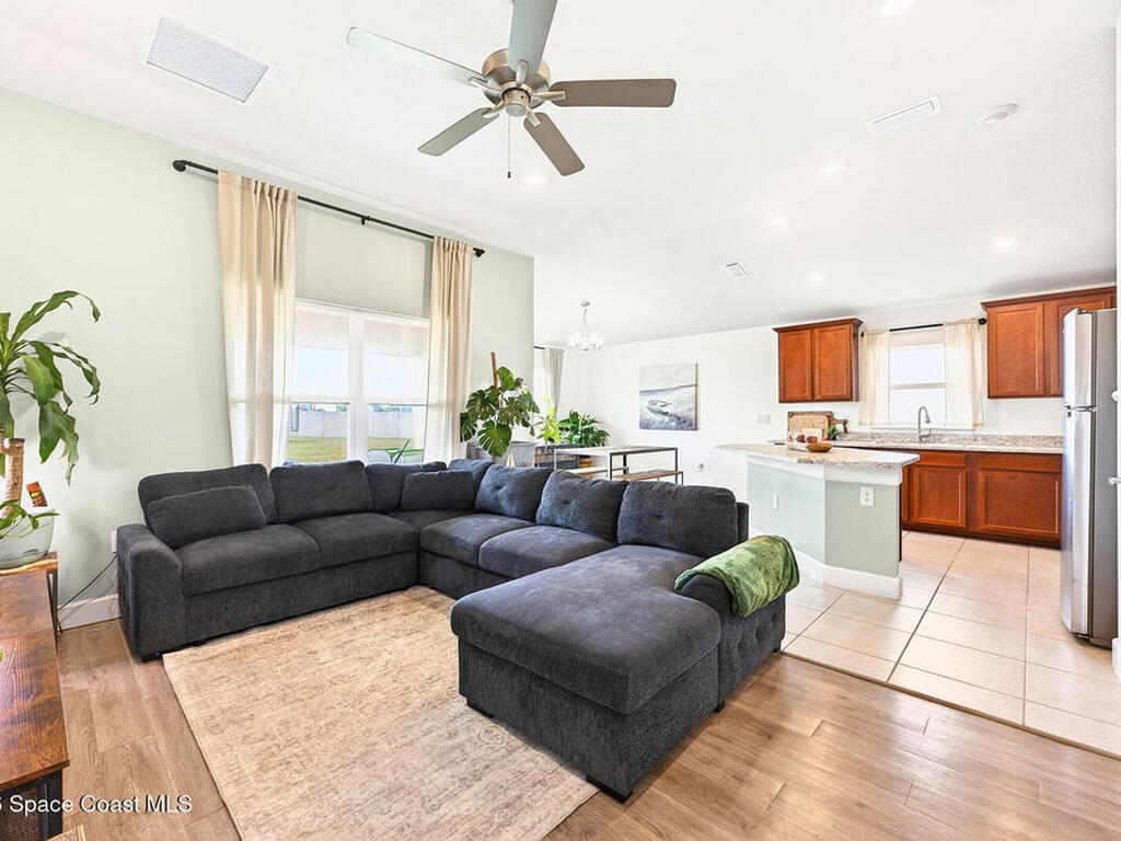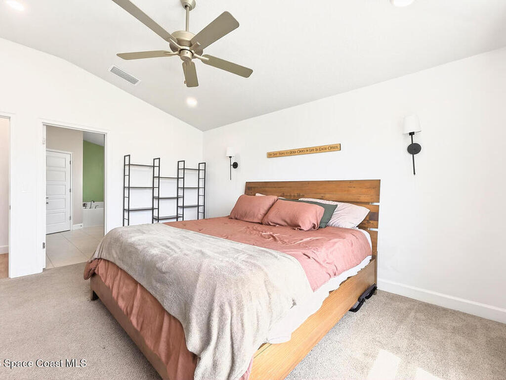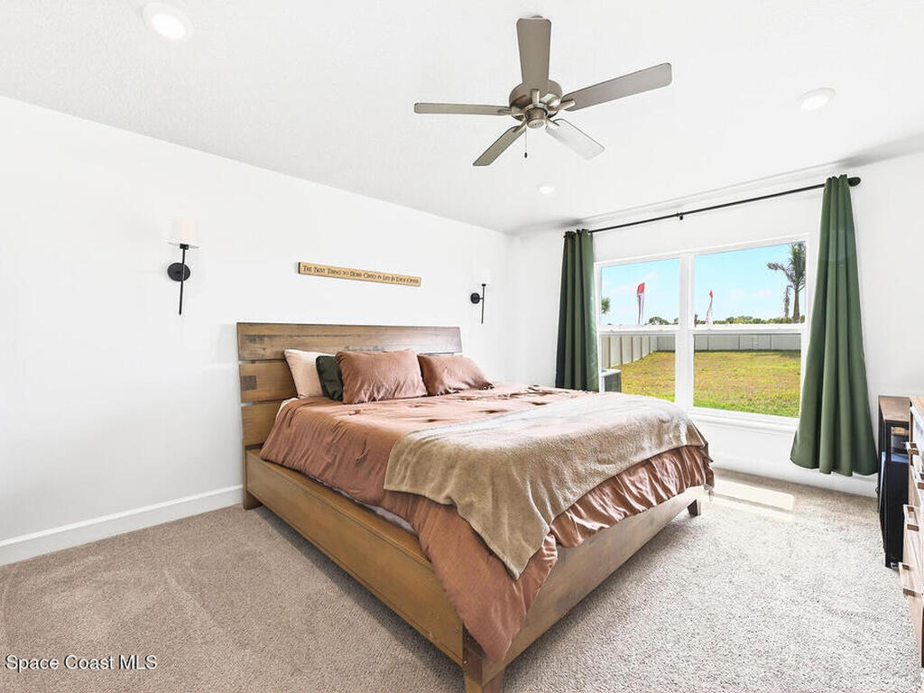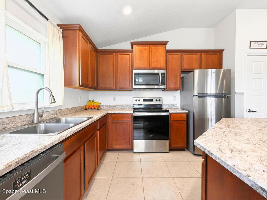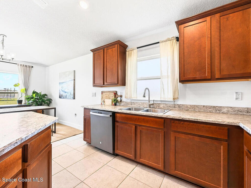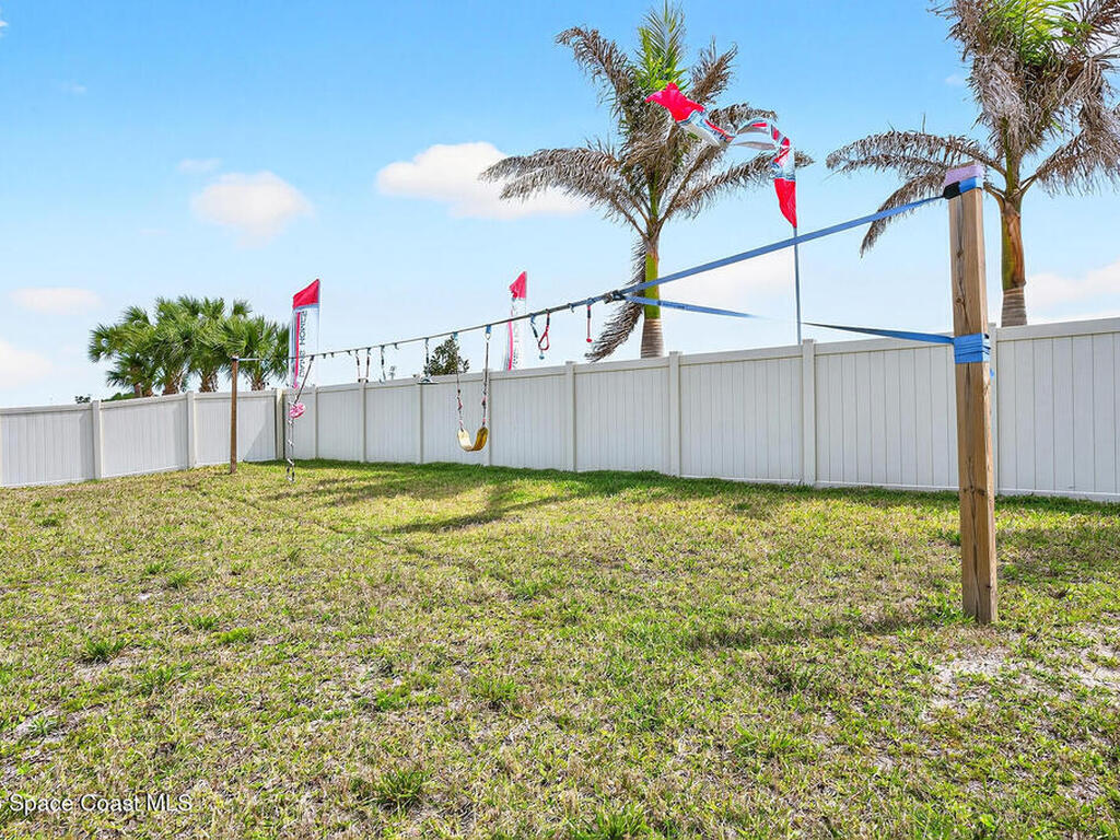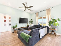 BUILT IN 2022, this MOVE-IN READY single-story block home in St Johns Preserve offers the comfort of newer construction with one of the largest lots in the community at .33 ACRES! Well maintained and thoughtfully designed, this 3-bedroom, 2-bath home still feels like new and sits in a GOLF CART FRIENDLY ~ GATED COMMUNITY with great AMENITIES and an ideal location close to everything Palm Bay has to offer. Inside, the light, bright OPEN CONCEPT layout creates a welcoming space for everyday living and entertaining. The kitchen, dining, and living areas flow seamlessly together, anchored by the well-appointed kitchen designed for both style and function. The home chef will appreciate the large CENTER ISLAND with bar seating, STAINLESS STEEL APPLIANCES, pantry storage, cabinets topped with crown molding, and a cheerful window over the sink that fills the space with natural light. The SPLIT BEDROOM floor plan provides privacy and flexibility with the primary suite perfectly situated