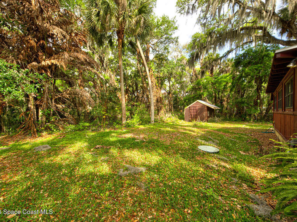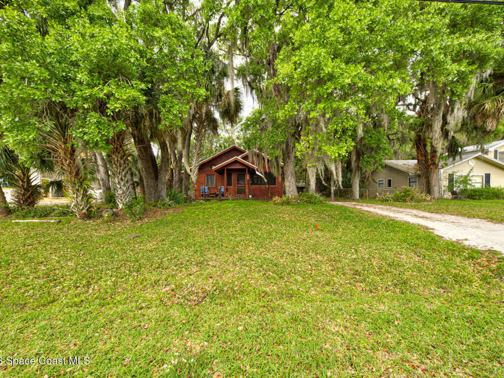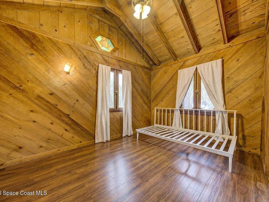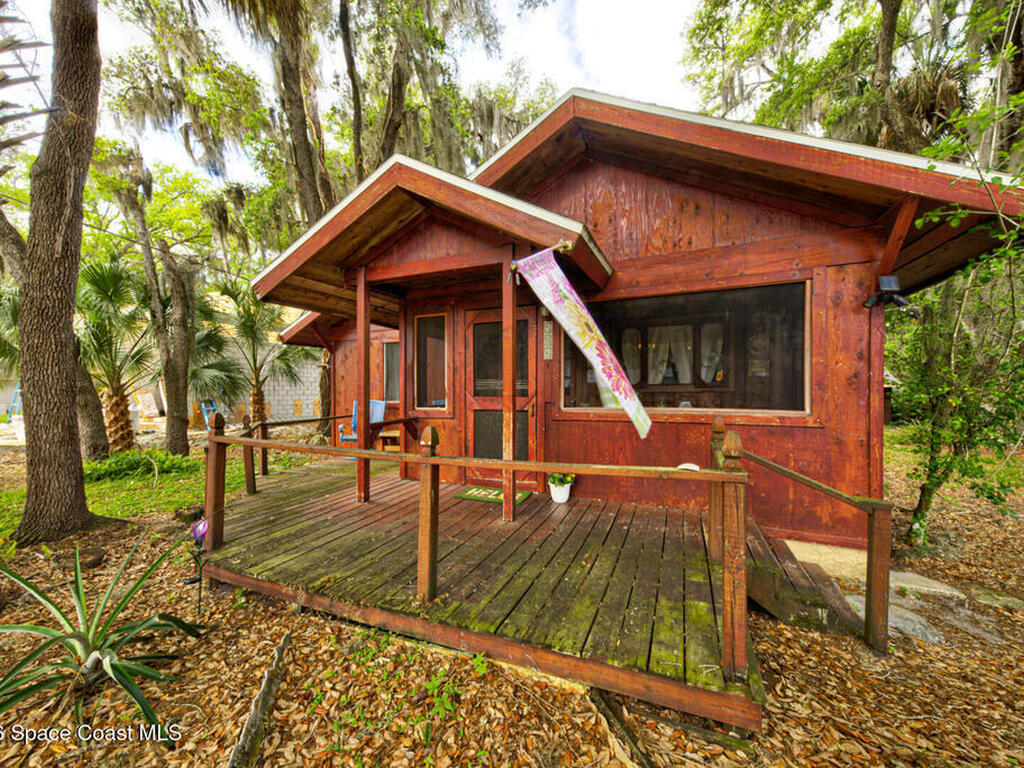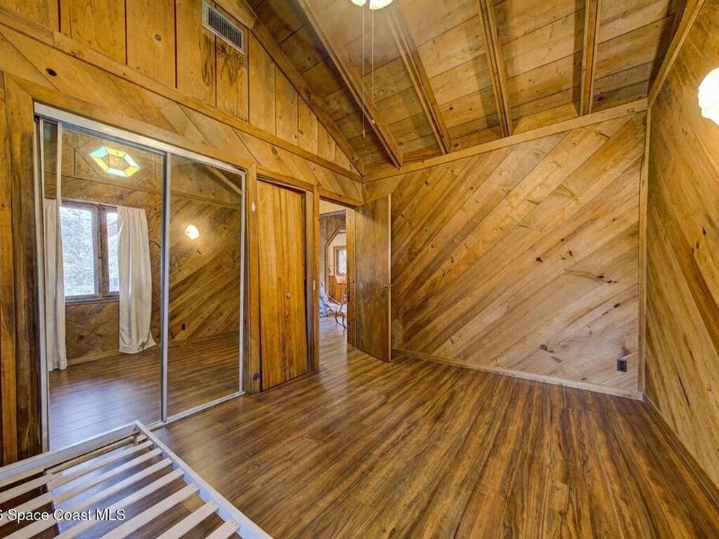 Beautiful and unique all wood home tucked away in the heart of Palm Bay. Surrounded by mature trees and lush greenery, this 1978 property offers a warm cabin like feel that makes you forget how close you are to everything. Inside, vaulted ceilings and a decorative fireplace create a cozy and inviting atmosphere full of character. Major updates include a 2018 roof, new septic system, new AC, and 2017 hot water heater. Enjoy the privacy and charm of this one of a kind retreat while being just minutes from shopping, dining, and the beaches.