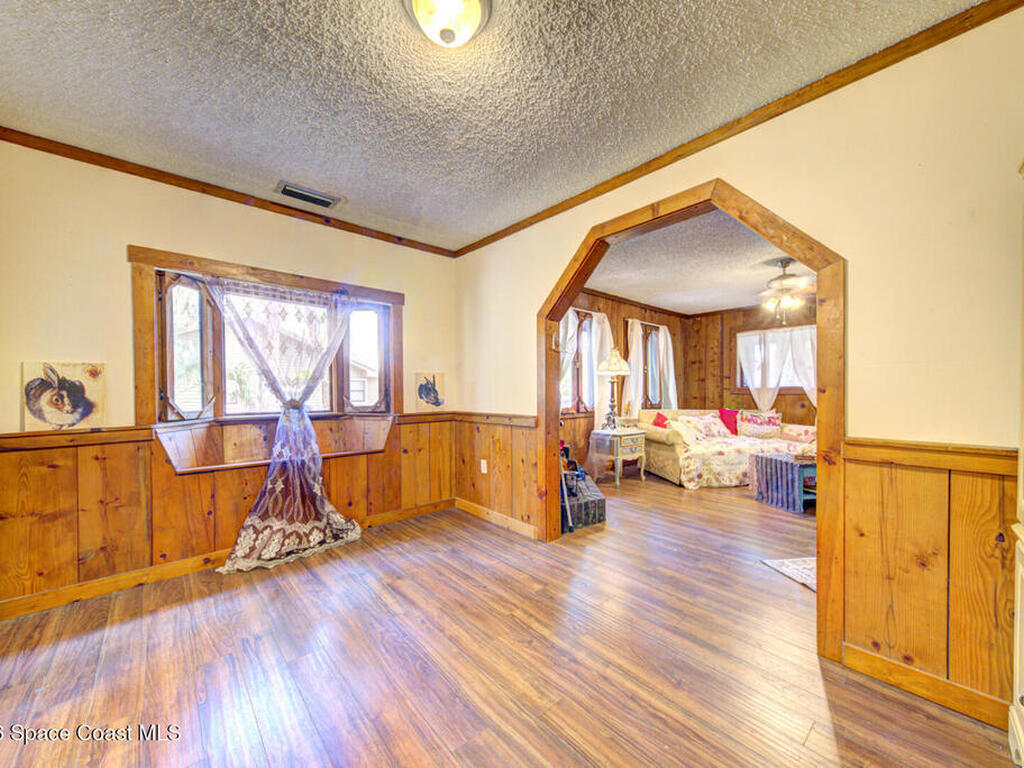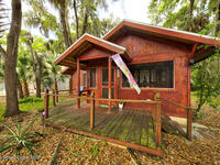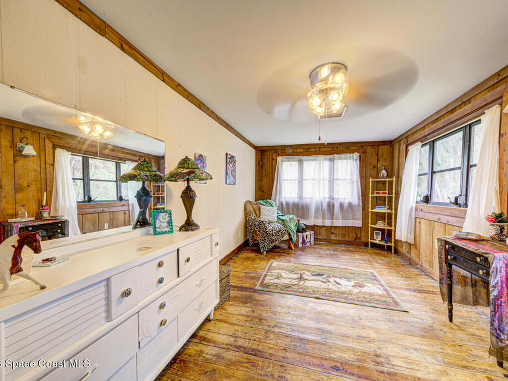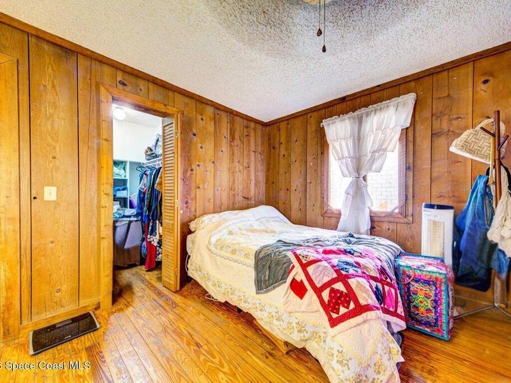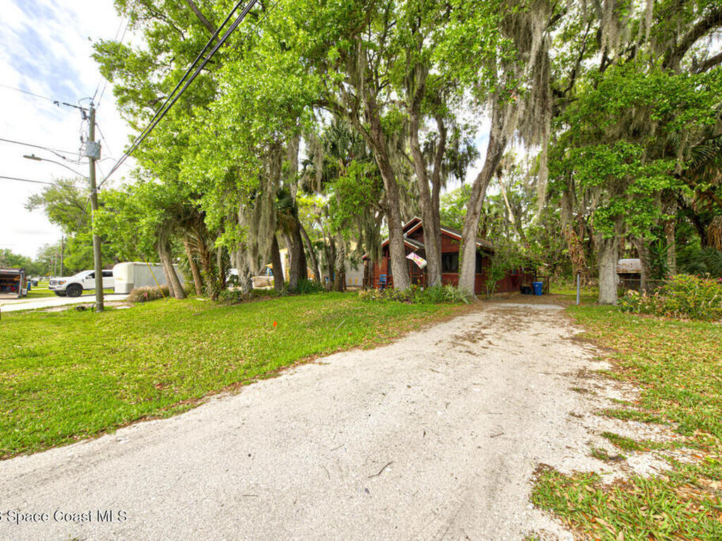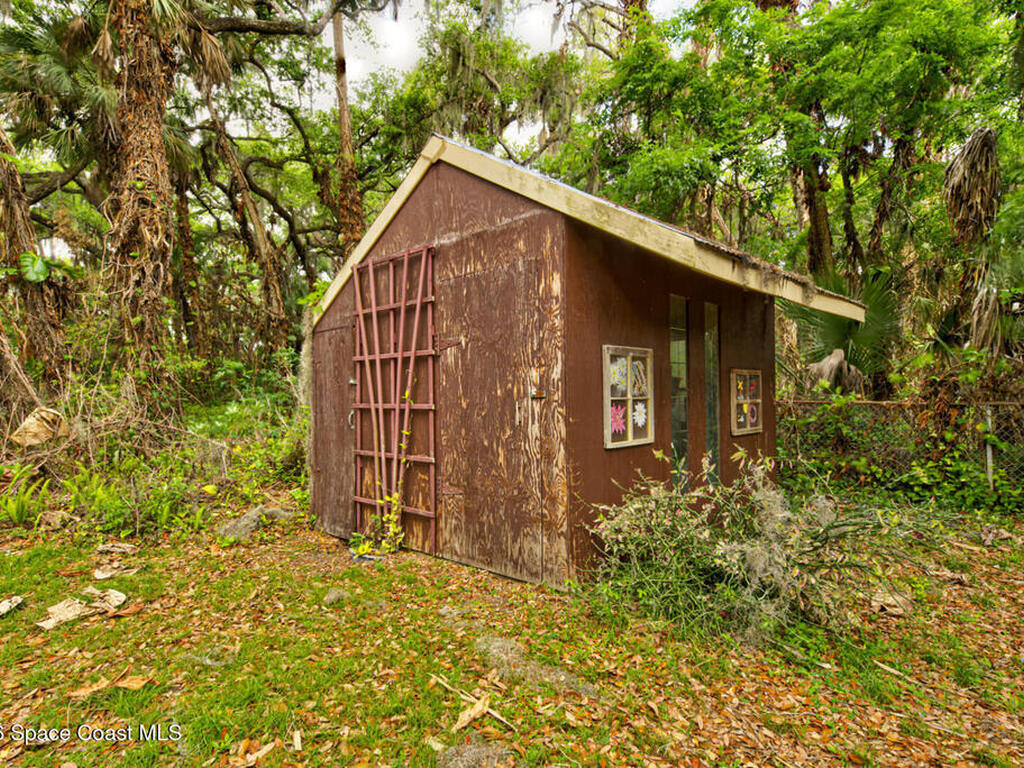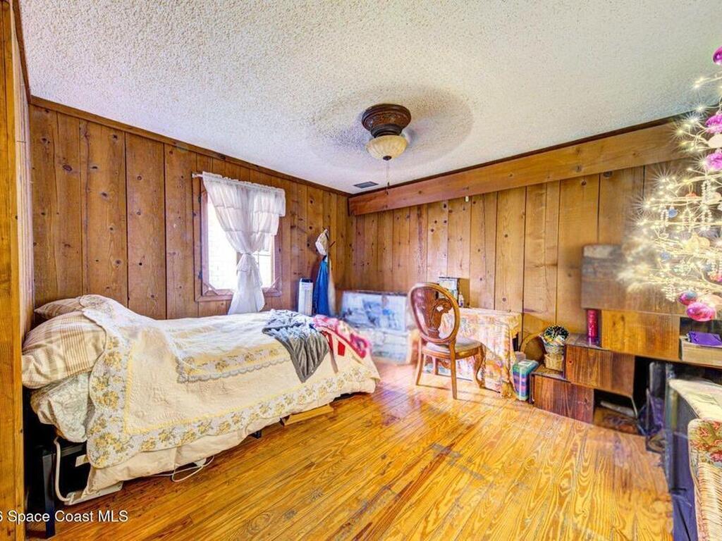 Beautiful and unique all wood home tucked away in the heart of Palm Bay. Surrounded by mature trees and lush greenery, this 1978 property offers a warm cabin like feel that makes you forget how close you are to everything. Inside, vaulted ceilings and a decorative fireplace create a cozy and inviting atmosphere full of character. Major updates include a 2018 roof, new septic system, new AC, and 2017 hot water heater. Enjoy the privacy and charm of this one of a kind retreat while being just minutes from shopping, dining, and the beaches.