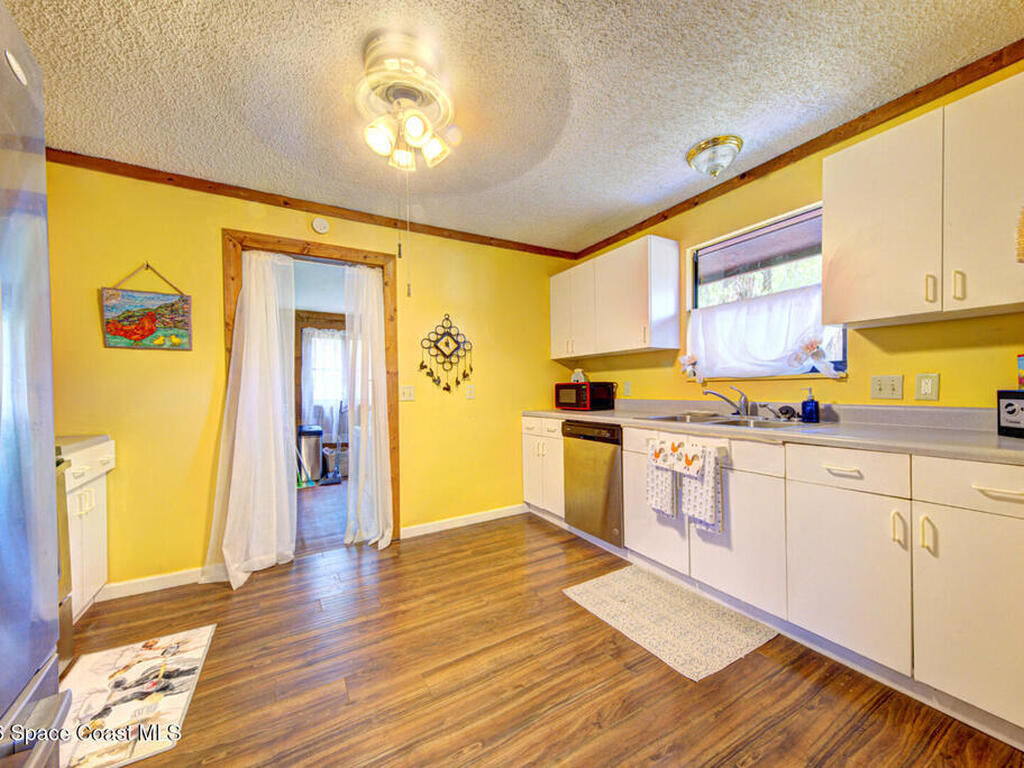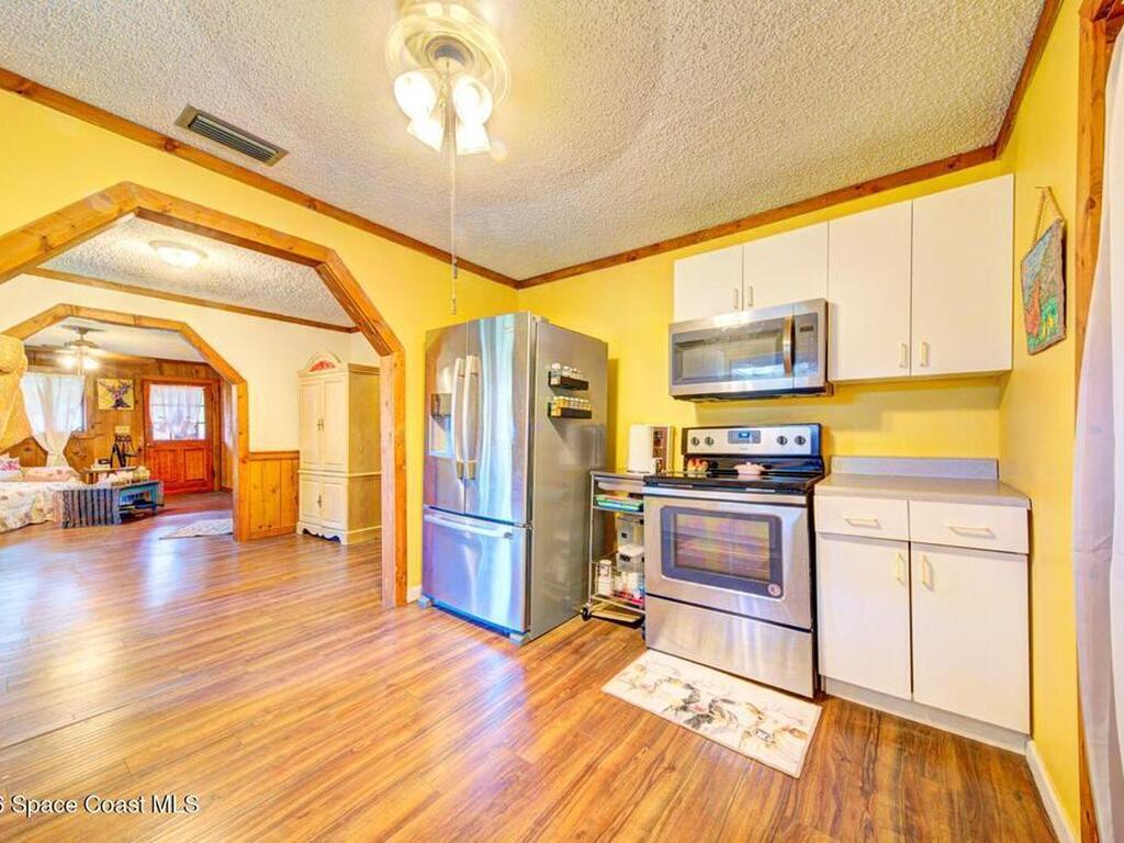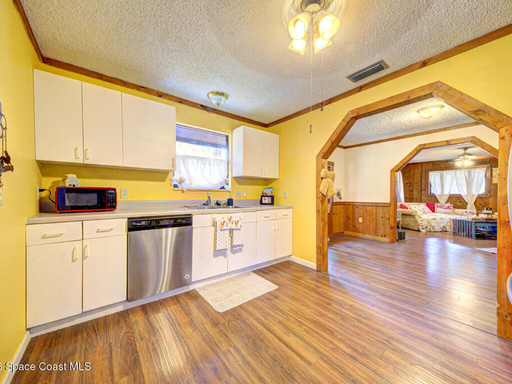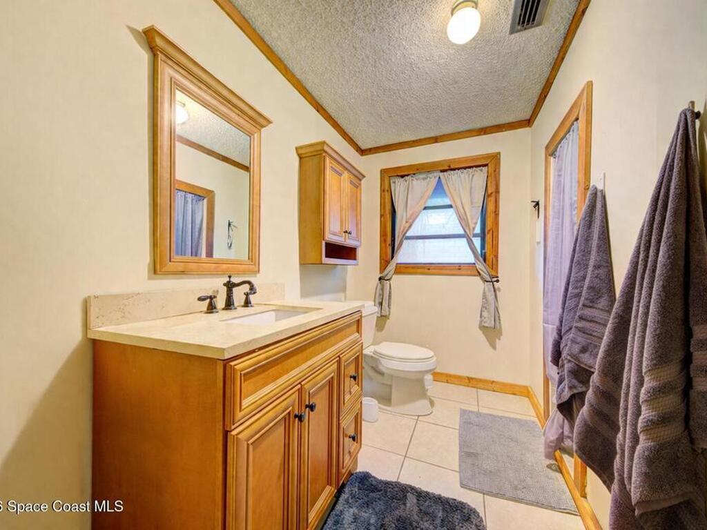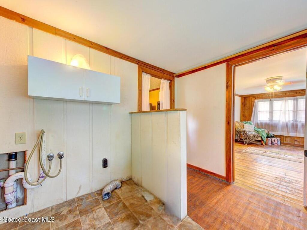 Beautiful and unique all wood home tucked away in the heart of Palm Bay. Surrounded by mature trees and lush greenery, this 1978 property offers a warm cabin like feel that makes you forget how close you are to everything. Inside, vaulted ceilings and a decorative fireplace create a cozy and inviting atmosphere full of character. Major updates include a 2018 roof, new septic system, new AC, and 2017 hot water heater. Enjoy the privacy and charm of this one of a kind retreat while being just minutes from shopping, dining, and the beaches.
