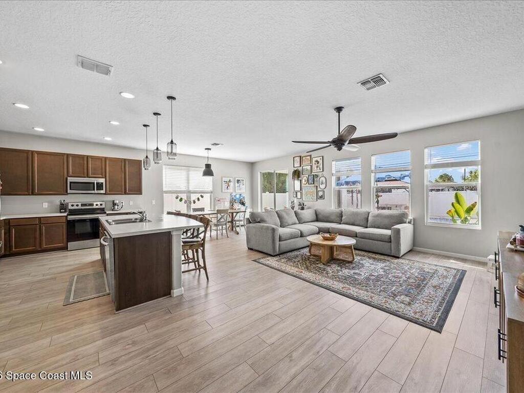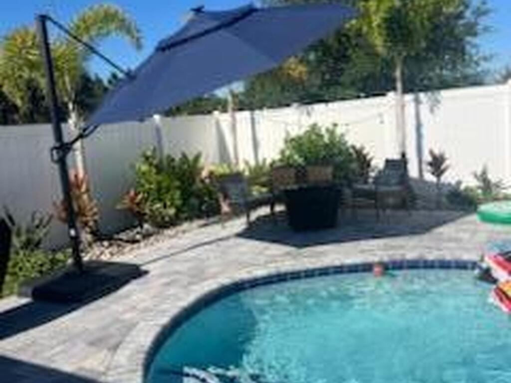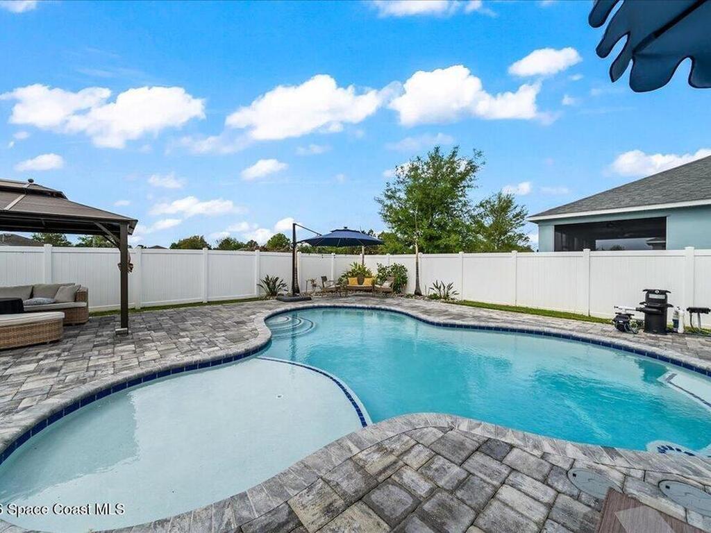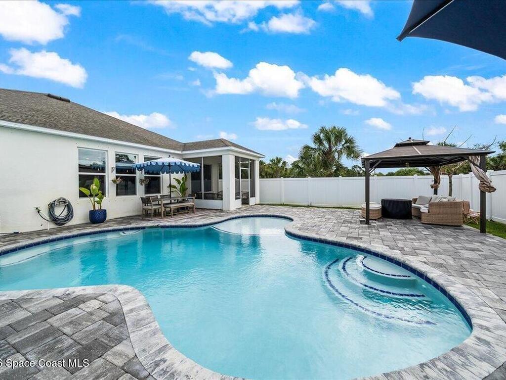 BEAUTIFUL POOL HOME, THIS 3/2 HOME HAS UPGRADED STONE ACCENTS, FEATURING AN OPEN FLOOR PLAN CONCEPT, A LARGE KITCHEN ISLAND SEPERATES THE KITCHEN FROM THE GREAT ROOM AND BREAKFEST NOOK. 42 INCH CABINETS AND STAINLESS-STEEL APPLIANCES. LARGE MASTER BEDROOM AND BATHROOM, COVERED PATIO, BRICK PAVERS, SALTWATER POOL SYSTEM, VARIBLE SPEED POOL PUMP, THIS POOL FEATURES A TANNING LEDGE THAT ALLOWS YOU TO PLACE SEVERAL CHAIRS IN THE 1-FOOT-DEEP WATER LEDGE, THE GAZEBO AND LARGE UMBRELLAS STAY WITH THE HOME.STORM SHUTTERS, IRRIGATION SYSTEM WITH PRIVATE WELL. CLOSE TO HWY I-95, THE MELBOURNE AIRPORT RESTAURANT, SHOPPING AND SCHOOLS. YOUR ONLY ABOUT AN HOUR FROM THE ORLANDO ATTRACTIONS LIKE DISNEY, SEAWORLD, UNIVERSAL STUDIO'S AND MORE.