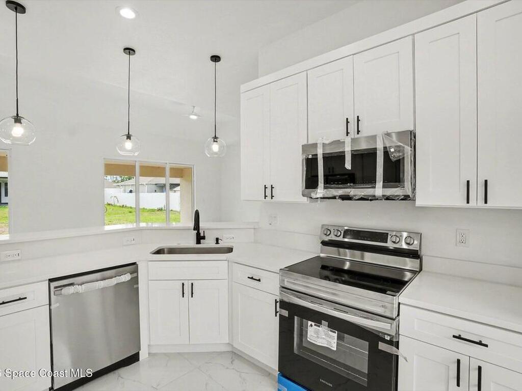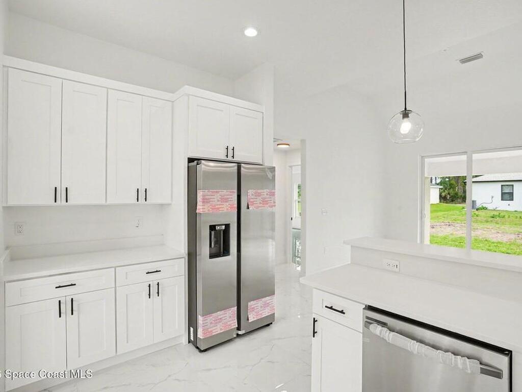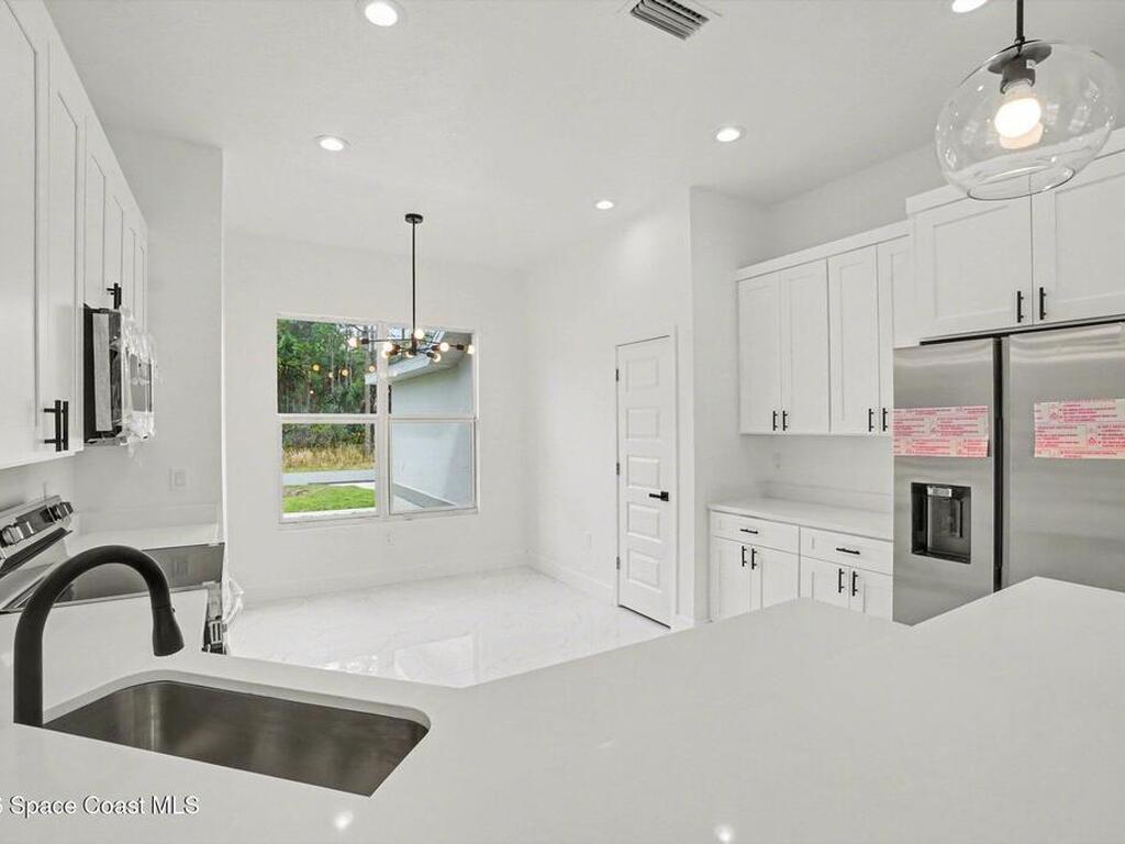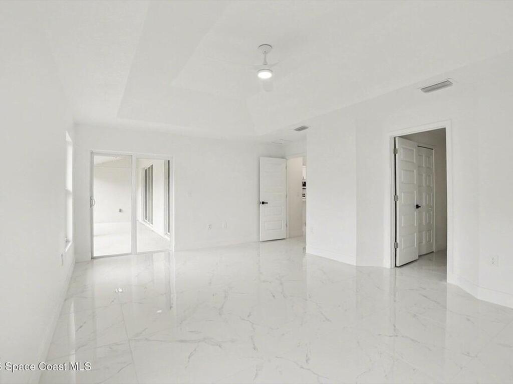 This beautifully designed 4 bed 2 bath concrete block home features elegant tile throughout its 2, 052 square feet of living space. The modern kitchen includes stainless steel appliances, granite countertops, small breakfast nook, bar, and pendant lighting, perfect for cooking and entertaining. With four bedrooms and two baths, there's plenty of room for family and guests. This home has a split plan with a connecting bathroom for one bedroom that can be used when company is in town. The primary suite has 2 large walk-in closets, double vanity, tile shower, and separate tub and toilet, a large patio accessible through sliding glass doors, along with the living and dining areas also having double sliders, bringing in lots of natural light. All windows are impact resistant for added security. This home is a must-see for anyone looking for comfort and style!